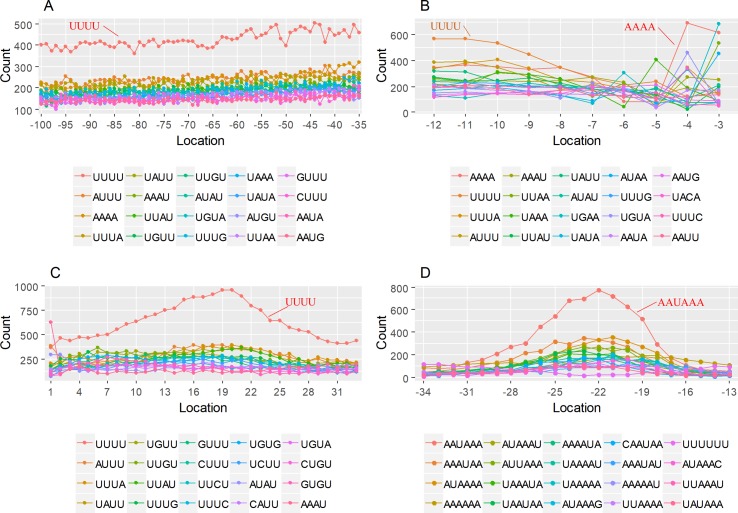 Figure 3. Top-ranked patterns in different poly(A) signal elements. (A) Top 20 4-nt patterns in USE according to the occurrence number in the upstream region of poly(A) site (−34 to −100 bp). (B) Top 20 4-nt patterns in CEL according to the occurrence number in the upstream region of poly(A) site (−3 to −12 bp). (C) Top 20 4-nt patterns in CER according to the occurrence number in the downstream region of poly(A) site (2 to 34 bp). (D) Top 20 4-nt patterns in PE region according to the occurrence number in the downstream region of poly(A) site (−13 to −34 bp).