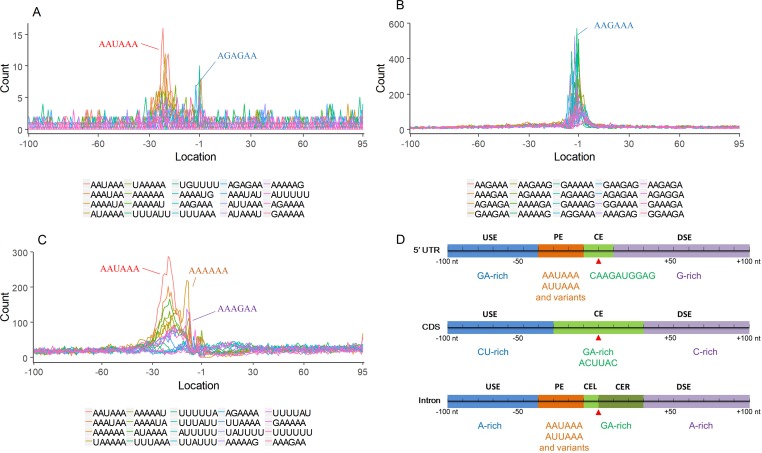 Figure 4. Signal distribution of non-3′ UTR APA sites in X. tropicalis. (A) Top 20 hexamers according to the occurrence number from −100 to 100 bp around 5′ UTR poly(A) sites. The signal has changed dramatically in the −40 nt to −1 nt. The most significant signal in PE region is AAUAAA, similar to the PE signal on the 3′ UTR. (B) Top 20 hexamers according to the occurrence number from −100 to 100 bp around CDS poly(A) sites. The most significant hexamer is ACUUAC, and the highly overlapping hexamer is AAGAAA in CE. (C) Top 20 hexamers sorted according to the occurrence number from −100 to 100 bp around intronic poly(A) sites. The most significant signal is AAUAAA in PE, and there is a GA-rich element around CS. (D) Polyadenylation signal models on 5′ UTR, CDS, and intron. The red triangle denotes the poly(A) site. USE, upstream sequence element; PE, positioning element; CE, cleavage element; CEL, left cleavage element; CS, cleavage site; CER, right cleavage element; DSE, downstream sequence element.