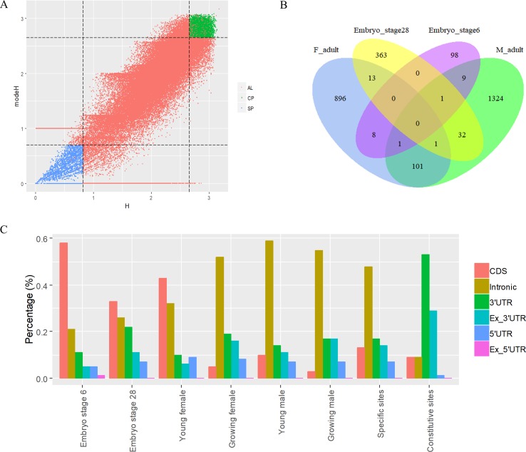 Figure 5. Characteristics of poly(A) signals during the development of X. tropicalis. (A) Information entropy distribution of poly(A) sites. The x-axis is the conventional information entropy (H), and the dashed lines represent thresholds of 0.82 and 2.66. The y-axis represents the adjusted information entropy (modeH), and the dashed lines represent thresholds of 2.65 and 2.70. Each point denotes one poly(A) site. Specific site is colored in blue, and constitutive site is colored in red. Red points in the top-right and bottom-left corners are sites that were selected based on the entropy value but were not defined as specific or constitutive sites because of their low expression levels (supported by less than five reads). AL: all poly(A) sites; SP: specific sites; CP: constitutive sites. (B) Venn diagram showing the overlap of specifically expressed genes at different developmental stages. “F_adult” includes young females and growing females. “M_adult” includes young males and growing males. (C) Percentages of specific poly(A) sites located in different locations across different periods. We randomly selected the same number of specific sites and constitutive sites and calculated the percentage of the genomic regions where these sites are located. In this figure, we only selected six periods (embryo stage 6, embryo stage 28, young female, growing female, young male, and growing male) with sufficient quantity for analysis.