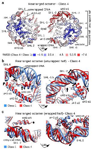Fig. 2. Histone octamer rearranges when DNA unwraps.a, RMSD (Cα) between the models for the Class 1 and the Class 4 structures showing the extent of rearrangements in the NCP. The DNA at SHL +- 2 and SHL +- 6-7 shows the largets movements between the Class 4 and canonical nucleosome structures. H3 αN, H3 α1 and α2, uH2A α2 and uH2B α1 show the largest rearrangements in the histone octamer.b, Conformational rearrangement of H3 in the half of the nucleosome with the unwrapped DNA. uH3 αN, uH3 α1 and uH3 α2 move in the Class 4 structure when compared to the Class 1 structure. DNA at SHL -2 moves outward.c, Conformational rearrangement of H3 in the half of the nucleosome with the wrapped DNA. wH3 αN and wH3 α1 move in the Class 4 structure when compared to the Class 1 structure. DNA at SHL 2 moves outward. wH3 αN and DNA at SHL -7 (second entry-exit site) move inward.