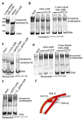 Fig. 4. Cross-linked H2A–H2B is not stably bound to the nucleosome.a, Native gel showing nucleosome assembly with native and cross-linked H2A–H2B. When nucleosome were assembled with cross-linked H2A–H2B, primarily hexasomes were obtained.b, Native and cross-linked H2A–H2B were added to the assembled hexasomes (a) containing one cross-linked H2A–H2B. Native H2A–H2B is incorporated into hexasome forming the nucleosome. Cross-linked H2A–H2B is not stably incorporated into the hexasome.c, Native gel showing nucleosome assembly with native and cross-linked globular H2A–H2B. Native and cross-linked globular H2A–H2B were added to the previously assembled hexasomes containing one cross-linked H2A–H2B. Native full length and globular H2A–H2B are incorporated into hexasome forming the nucleosome. Cross-linked globular H2A–H2B is not stably incorporated into the hexasome.d, Native gel showing Nap1-mediated nucleosome assembly with native and cross-linked H2A–H2B. When we used cross-linked H2A–H2B, Nap1 also primarily assembled hexasomes (input). Native and cross-linked H2A–H2B were added to the assembled hexasomes. Nap1 incorporated native H2A–H2B into hexasomes forming nucleosomes. Nap1 was unable to incorporate cross-linked H2A–H2B into the hexasomes.e, Native gel showing Nap1-mediated nucleosome assembly with native and cross-linked globular H2A–H2B. Native and cross-linked globular H2A–H2B were added to the assembled hexasomes. Nap1 incorporated native globular H2A–H2B into hexasomes forming nucleosomes. Nap1 was unable to stably incorporate cross-linked globular H2A–H2B into the hexasomes.f, Unwrapping of DNA at SHL 5.5 induces conformational changes in H2A–H2B. Rearrangement of H2A α2 and α3 and H2B α1 maintains the interaction with the DNA and stabilizes the nucleosome.Representative images of at least 3 independent experiments are shown. Uncropped gel images are shown in Supplementary Data Set 1.