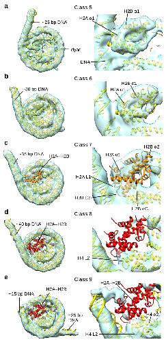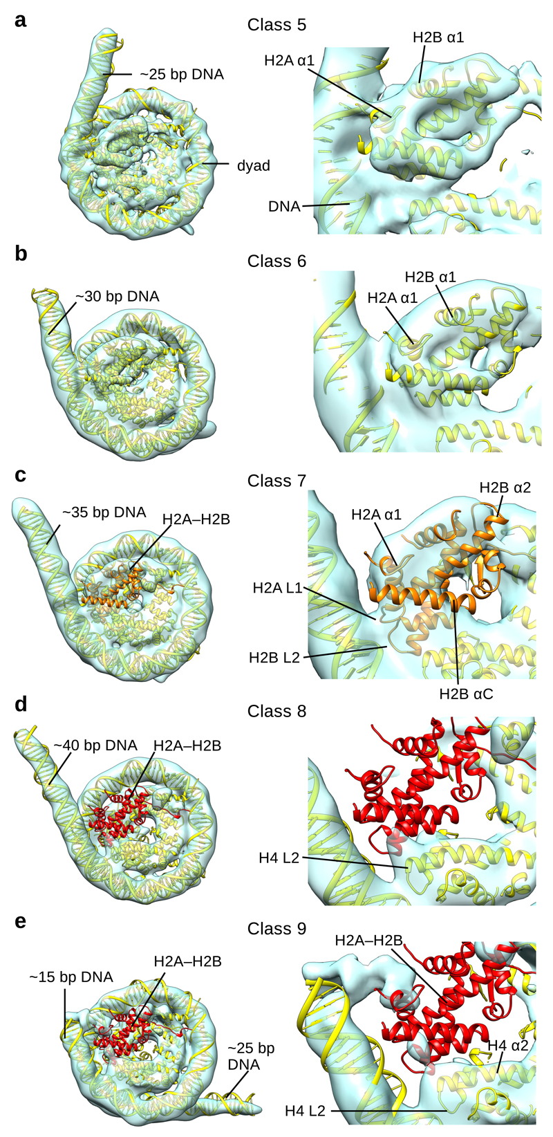 Fig. 5. Cryo-EM reconstructions of distinct NCP and hexasome conformations.a, Cryo-EM map of NCP (Class 5) with docked model (left). ~25 bp of DNA is not organized by the nucleosome in Class 5. A close view of the H2A–H2B dimer and the last contact with the DNA is shown on the right.b, Cryo-EM map of NCP (Class 6) with docked model (left). ~30 bp of DNA is not organized by the nucleosome in Class 6. A close view of the H2A–H2B dimer and the last contact with the DNA is shown on the right.c, Cryo-EM map of NCP (Class 7) with docked model (left). ~35 bp of DNA is not organized by the nucleosome in Class 7. A close view of the H2A–H2B dimer and last contact with the DNA is shown on the right. Only partial density could be observed for the H2A–H2B dimer, colored orange.d, Cryo-EM map of the hexasome (Class 8) with docked model (left). ~40 bp of DNA is not organized by the nucleosome in Class 8. A close view of the last contact with the DNA is shown on the right. No density for H2A–H2B dimer, colored red, could be observed in the map.e, Cryo-EM map of the hexasome (Class 9) with docked model (left). ~15 + ~25 bp of DNA is not organized by the nucleosome in Class 9. A close view of the last contact with the DNA is shown on the right. No density for the H2A–H2B dimer, colored red, could be observed in the map.