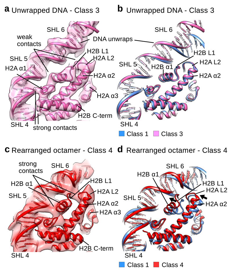 Fig. 3. H2A–H2B dimer rearranges and binds unwrapping DNA.a, Fitting of the Class 3 model into the cryo EM map. In the Class 3 cryo EM map H2B α1 (SHL 4.5), H2B L1 (H2B α1 and α2) and H2A L2 (H2A α2 and α3) (SHL 5.5) form weaker contacts with the DNA that are only visible at low contour level. H2A α1 at SHL 4.5 and H2A–H2B contacts at SHL 3.5 are similar to the contacts on the side with wrapped DNA.b, Comparison of the Class 1 model (blue) with the model for the Class 3 (pink) cryo EM map. In the Class 3 structure, H2A–H2B is in the conformation observed in the crystal structure. DNA at SHL 5 moves outward when compared to the Class 1 model.c, Fitting of the Class 4 model into the cryo EM map. In the Class 4 cryo EM map H2B α1 (SHL 4.5), H2B L1 (H2B α1 and α2) and H2A L2 (H2A α2 and α3) (SHL 5.5) form strong contacts with the DNA that are comparable to other contacts between histones and DNA.d, Comparison of the Class 1 model (blue) with the model for the Class 4 (red) cryo EM maps. In the Class 4 structure, H2B α1 and α2 and H2A α2 and α3 tilt toward the unwrapping DNA to stabilize the interaction.