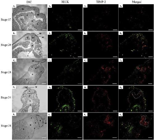 Fig. 2. Localization of RECK and TIMP-2 proteins during early X. laevis development. Immunohistochemistry was performed using Alexa Fluor 488-labeled anti RECK (green) and Alexa Fluor 555-labeled anti-TIMP-2 (red) antibodies on stage 17â38 embryos. Brightfield DIC images are shown on the left panels. Mono-colour images for RECK and TIMP-2 are presented individually. Colocalization of RECK and TIMP-2 (yellow) is indicated on the right panels. Dotted line in stage 28 merged image indicates overlapping signal within the middle of somites. Dashed line in stages 34 and 38 merged images indicates overlapping signal along the ventral neural tube. Scale barâ¯=â¯100 μm. Abbreviations: Eâ¯=â¯endoderm, Epâ¯=â¯epidermis, Dâ¯=â¯dorsal NT, DFâ¯=â¯dorsal fin, Nâ¯=â¯notochord, NCâ¯=â¯neural crest, NPâ¯=â¯neural plate, NTâ¯=â¯neural tube, Sâ¯=â¯somitic mesoderm, Vâ¯=â¯ventral NT.