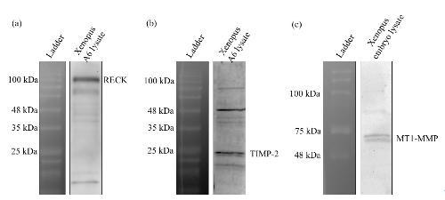 Supplementary Fig. 3 Validation of Antibodies: (a) A blot probed with human rabbit anti-RECK shows a specific band at the expected molecular weight (110 kDa) in Xenopus A6 cell lysate. (b) A blot probed with human mouse anti-TIMP-2 shows a specific band at the expected molecular weight (21 kDa) in Xenopus A6 cell lysate. (c) A blot probed with human rabbit anti-MT1-MMP shows a specific band at the expected molecular weight (65 kDa) in Xenopus whole embryo lysate