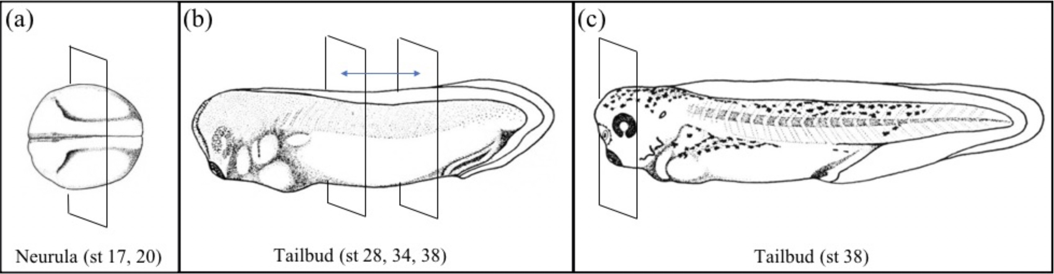 Supplementary Fig. 1. Schematic diagram representing the location of the transverse sections on Xenopus embryos. Transverse sections (10 µm apart) were made in the mid anterior-posterior axis (as delineated by the boxes) of (a) neurulating embryos (stages 17 and 20) and (b) early/late tailbud embryos (stages 28, 34, and 38). (c) Transverse sections (10 µm apart) were made in the anterior head region (as delineated by the box) in late tailbud embryos (stage 38).