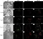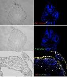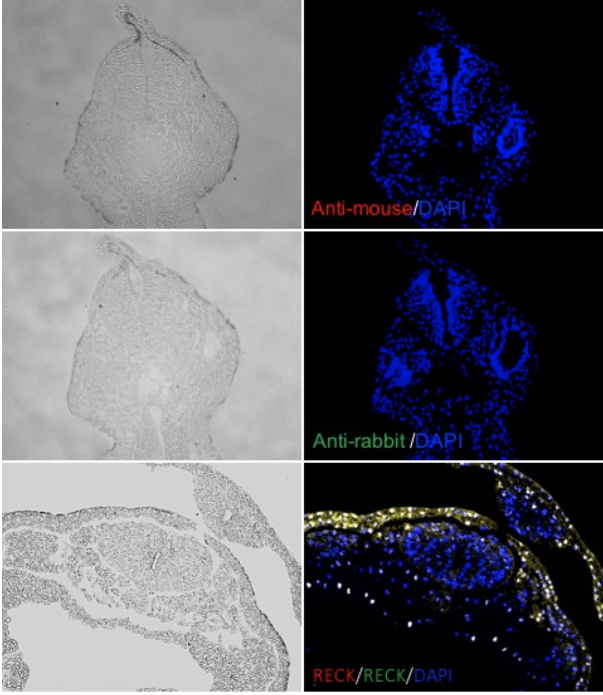 Supplementary Fig. 2 Immunohistochemistry was performed using only secondary antibodies (Alexa Fluor 555-labeled anti-mouse (red) and Alexa Fluor 488 anti-rabbit (red)) and costained with DAPI (blue) on stage 34 embryos to establish specificity in the experiment (right panels). Sections were also probed with both primary RECK antibodies used in these experiments (Alexa Fluor 555-labeled mouse anti-RECK (red) and Alexa Fluor 488 labeled rabbit anti-RECK (green)) and costained with DAPI (blue) to validate their specificity. Colocalization is indicated on the bottom right panel (yellow). Brightfield DIC images are shown on the left panels. (Please print in colour).
