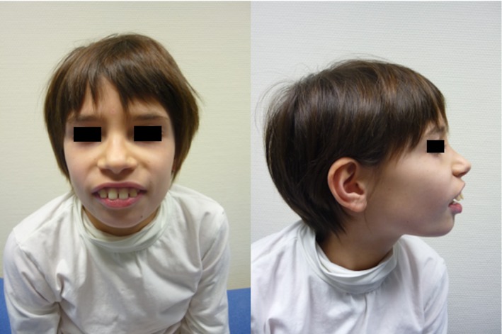 Figure 1. Facial features of patient 3 showing a large mouth, smooth philtrum, up‐slanting palpebral fissure, and dental enlargement.