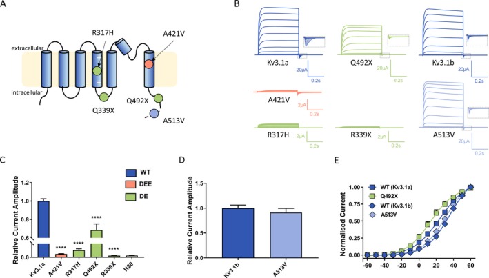Figure 2. Functional expression of Kv3.1 variants in Xenopus laevis oocytes (A) Schematic of the Kv3.1 channel with putative positions of variants reported in this study (Orange ‐ Developmental and Epileptic Encephalopathy [DEE] variant; Green ‐ Developmental Encephalopathy variants [DE]; Light blue ‐ variant of uncertain significance). The dashed line shows the distal part of the C‐terminus that is present only in the longer transcript variant (Kv3.1b) indicating that the A513V variant is only found in this transcript. (B) Representative traces of whole‐cell currents recorded from Xenopus laevis oocytes injected with the same amount of cRNA encoding Kv3.1 wild‐type (Kv3.1a and Kv3.1b) and different variants during 0.5 sec voltage steps ranging from − 60 mV to + 60 mV. Insets show blown up tail currents, which were analyzed to generate conductance‐voltage relationships for WT and mutant channels shown in E. (C, D) Current amplitudes analyzed at the end of the voltage step to + 60 mV and normalized to the mean current amplitude of the corresponding WT recorded on the same day; Kv3.1a (n = 136), A421V (n = 62), R317H (n = 32), Q492X (n = 30), R339X (n = 48), and water (n = 35); Kv3.1b (n = 15), A513V (n = 17). ****P < 0.0001, using one‐way ANOVA with Dunnett’s multiple comparisons test (C). Mann–Whitney non‐parametric test (D) revealed P = 0.5. (E) Conductance‐voltage relationships for the WT transcripts and variants showing current amplitudes above the background level. V0.5 and k values were as follows: for Kv3.1a 23 ± 2 mV, 12.8 ± 0.6 (n = 37), for Kv3.1b 33.8 ± 1.1 mV, 12.80 ± 1.04 (n = 18), for Q492X 15 ± 3 mV, 12.7 ± 0.8 (n = 19), and for A513V 29 ± 2 mV, 11.6 ± 0.6 (n = 21); V0.5 Kv3.1a vs V0.5 Kv3.1b, ANOVA with Tukey’s multiple comparisons test.