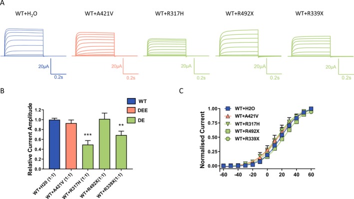 Figure 3. Dominant‐negative effect of Kv3.1 variants. (A) Representative current traces recorded from Xenopus laevis oocytes injected with the same amount of cRNA encoding Kv3.1a wild‐type with addition of either H2O or the same amount cRNA encoding Kv3.1 variants in a 1:1 ratio. (B) Current amplitudes analyzed at the end of the voltage step to + 60 mV and normalized to the mean current amplitude of WT + H2O recorded on the same day revealed a significant reduction for R317H and R339X but not for the A421V coexpression, ***P < 0.001, **P < 0.01 using one‐way ANOVA with Dunnett’s multiple comparisons test; WT + H2O (n = 111), WT + A421V (n = 62); WT + R317H (n = 11); WT + Q492X (n = 21); WT + R339X (n = 17). (C) Conductance‐voltage relationships of the WT and its coexpressions with A421V, R317H and R339X. V0.5 and slope factor (k) values were as follows: for WT + H2O 18.2 ± 1.4 mV, 12.4 ± 0.4 (n = 27), for WT + A421V 16.6 ± 1.8, 15.2 ± 0.4 (n = 36), for WT + R317H 21.1 ± 4.5 mV, 17.8 ± 1.9 (n = 8), for WT + Q492X 25 ± 3 mV, 13.9 ± 0.5 (n = 12), and for WT + R339X 15.8 ± 3.1 mV, 12.2 ± 1.1 (n = 15).
