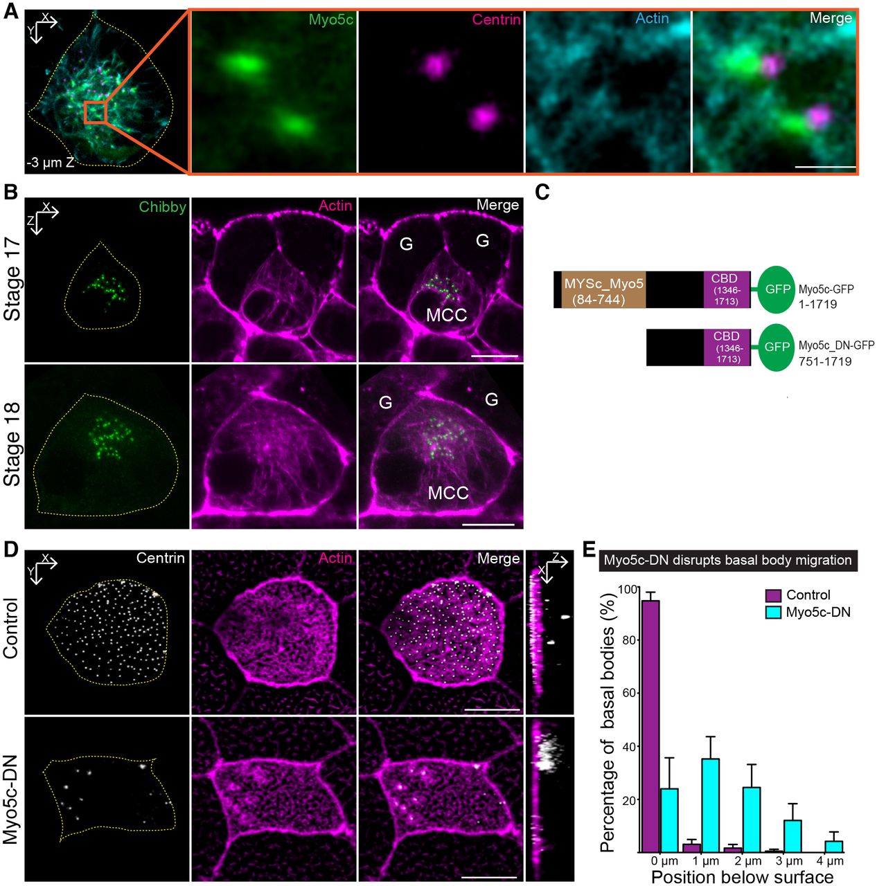 Fig. 2. Myo5c localizes to basal bodies and is required for basal body apical migration. (A) Myo5c–GFP (green) localized in proximity to basal bodies (marked by Centrin2–RFP, magenta) and aligned with actin cables (as marked by LifeAct–BFP, cyan). Images were taken at stage 19 and at 3 µm below (−3 μm Z) the apical surface of the MCC (outlined by a yellow dotted line). The orange square highlighted the region shown at a higher magnification in the four right-most panels. Scale bar: 1 µm. (B) Sagittal sections of early stage intercalating MCCs showing basal bodies (marked by Chibby–GFP, green) apparently migrating along actin cables (marked by phalloidin, magenta) to the apical surface of MCC. G, goblet cell. Scale bars: 5 µm. (C) The dominant negative (DN) form of Myo5c was generated by truncating the myosin motor domain of Myo5c (amino acids 84–744) to disrupt its migration ability, while leaving the cargo-binding domain (amino acids 1346–1713) intact. (D) Overexpression of the dominant-negative version of Myo5c (Myo5c-DN–GFP driven by α-tubulin promoter) disrupted basal body migration. In controls (GFP driven by α-tubulin promoter), most of the basal bodies (white) docked within the apical actin network (marked by phalloidin, magenta, and outlined by a yellow dotted line). Upon overexpression of Myo5c-DN, basal bodies failed to migrate apically and accumulated below the apical surface, see orthogonal views. Scale bars: 10 µm. (E) Quantification (mean±s.d.) of basal body positions in controls and upon overexpression of a Myo5c-DN in MCCs. More than 75% of the basal bodies in Myo5c-DN-overexpressing cells failed to migrate to the apical surface of MCCs. The mean±s.d. depth of basal bodies increased from 0.08±0.06 µm in controls to 1.37±0.35 µm below the apical domain (reference position, 0 µm) in Myo5-DN-expressing cells (***P<0.001, Mann–Whitney U-test; control, n=13 cells; Myo5C-DN, n=14 cells; N>5 embryos). |