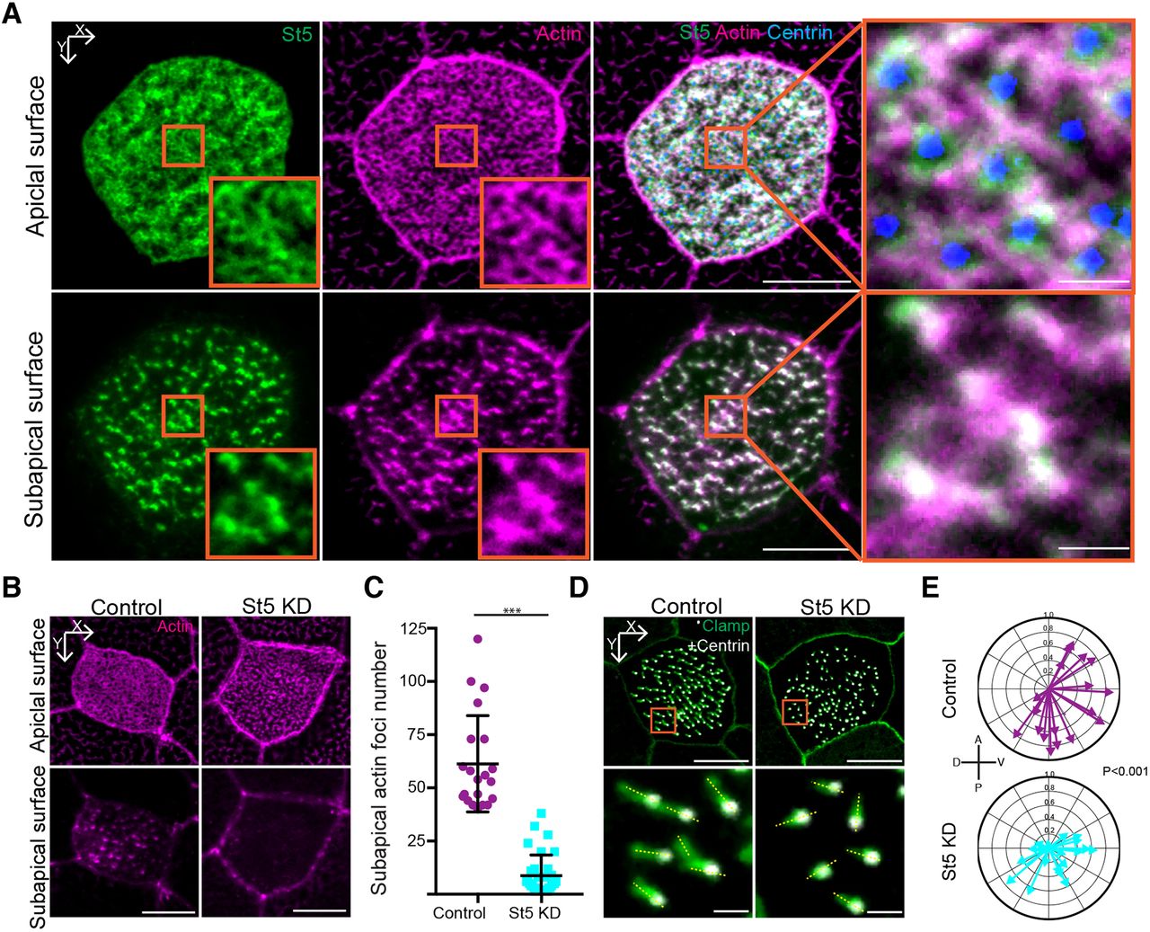 Fig. 3. St5 localizes to apical actin networks and is required for basal body planar polarity. (A) GFPâSt5 (green) localized to the apical and subapical actin network (marked by phalloidin, magenta). Scale bars: 10â µm (main images); 1â µm (magnified image). Images were taken at stage 32. (B) St5 knockdown (KD) reduced the number of subapical actin foci (actin marked by phalloidin, magenta). Scale bars: 10â µm. (C) The number of subapical actin foci was decreased from 61.3±22.7 in controls to 8.7±9.7 in St5 KD (P<0.001, MannâWhitney U-test; control, n=21 cells; St5 KD, n=33 cells; N>5 embryos). Data represent mean±s.d. (D) St5 KD disrupts basal body orientation. Orientation of basal bodies was determined by measuring the angle (yellow dotted line) between a basal body (marked by Centrin2, white) and its corresponding rootlet (marked by Clamp, green) in respect to the horizontal line. Scale bar: 10â µm (top panel), 1â µm (bottom panel). (E) Quantification of basal bodies orientation. Each arrow represents one cell, where length indicates uniformity of measured angle (as shown in D) in that cell (resultant vector). The mean±s.d. resultant vector value was decreased from 0.71±0.18 in controls to 0.39±0.2 in the St5 KD cells. (P<0.001, MannâWhitney U-test; control, n=19 cells; St5 KD, n=22 cells; N>5 embryos). |