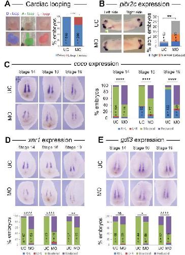 Fig. 1. agmo is required for L-R development. A) Depletion of Agmo disrupts cardiac looping. Lower images are pseudo-colored to highlight cardiac looping. B) Expression of pitx2c, which is normally only in left side mesoderm (upper row), is impaired in Agmo morphants (typically absent, lower row). abn.; abnormal C) coco expression is greatly reduced in the LRO from early in its development (before the initiation of flow, stage 14). LROs are dissected out and imaged ventrally. A; anterior, P; posterior, L; left, R; right. D) Expression of xnr1 and E) gdf3 is reduced in the left â right organizer of agmo morphants. Figure shows three developmental stages: stage 14 (pre-directional fluid flow) and stage 16 and 19. Graphs represent the combined results of six independent experiments for cardiac looping and xnr1, three repeats for pitx2, five repeats for coco, and 3 independent repeats for gdf3. UC; uninjected control, MO; morphant, ns; non-significant, *p â< â0.05, **p â< â0.01, ****p â< â0.0001 by Chi-square analysis. |