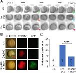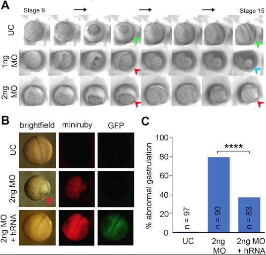 Fig. 2. Depletion of agmo impairs gastrulation. A) Time lapse images of gastrulation in uninjected control (UC, upper row), embryos injected with 1â¯ng MOATG (middle row) and embryos injected with 2â¯ng MOATG (lower row). UC embryos gastrulate normally, successfully closing the blastopore and forming the neural plate (green arrowheads). 1â¯ng MOATG embryos typically require several attempts to fully close the blastopore, and occasionally fail to complete gastrulation (blue arrowhead). 2â¯ng MOATG embryos never complete gastrulation despite multiple attempts (red arrowheads). B) The agmo morphant gastrulation phenotype can be rescued by co-injection of human AGMO mRNA (hRNA). Mini-ruby traces MOATG injection and GFP traces hRNA. Note that MOATG only embryos fail to gastrulate while co-injection of hRNA rescues the phenotype. Graph on right displays quantification of the human AGMO mRNA rescue. Data represent the combined result of three independent experiments. UC; uninjected control, MO; morphant. ****p â< â0.0001 by Chi-square analysis. |