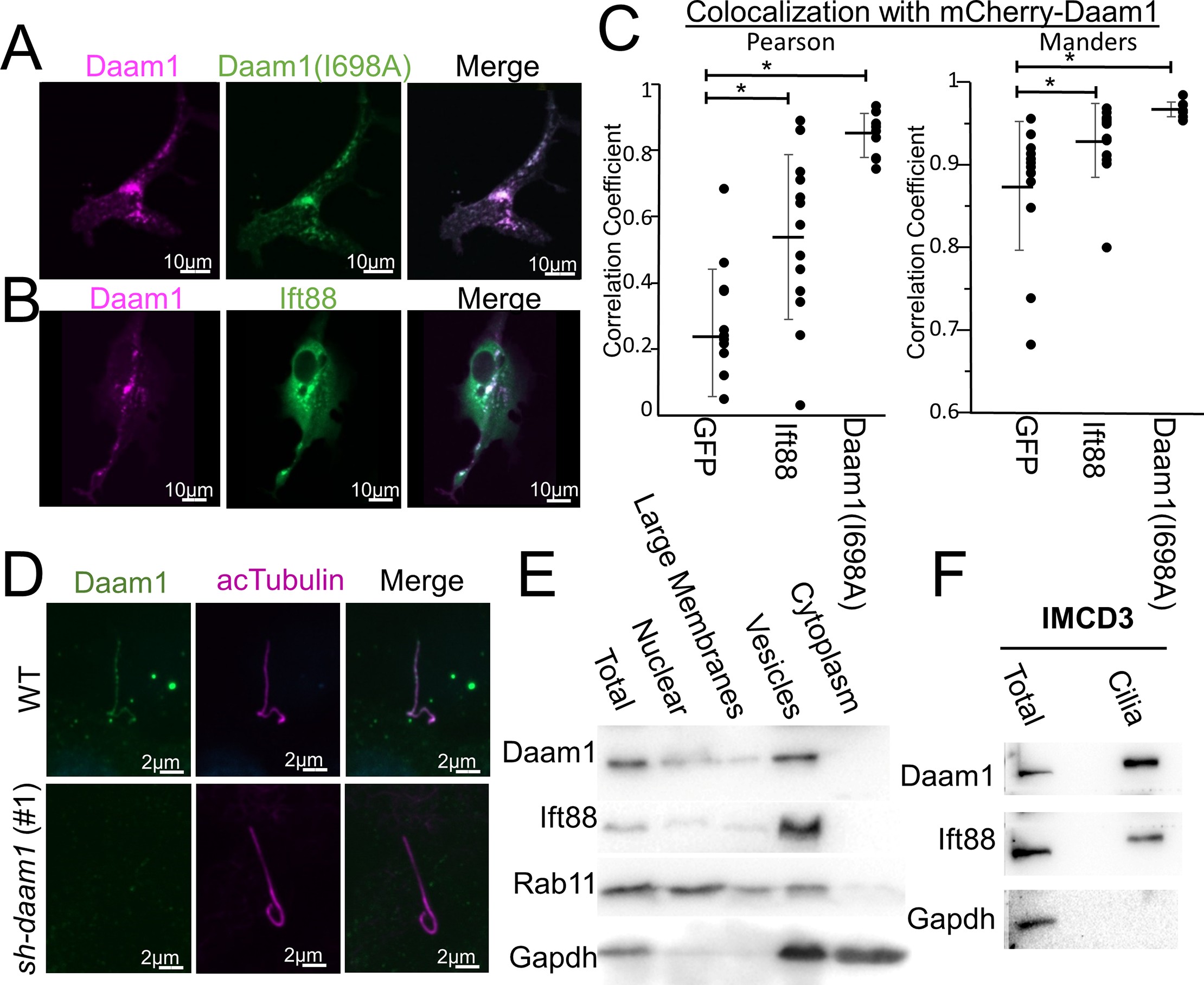 Fig 4. Daam1 localizes to ciliary vesicles and cilia. A) MDCKII cells were co-transfected with constructs that express mCherry-Daam1 and GFP-Daam1(I698A) then imaged via confocal to analyze the localization in live cells. B) MDCKII cells were co-transfected with constructs that express mCherry-Daam1 and Ift88-GFP than imaged via confocal in live cells to determine the subcellular localization. Scale bars equal to 10 μm. C) MCDKII Cells were transfected with mCherry-Daam1 along with GFP, GFP-Ift88, or GFP-Daam1(I698A), then colocalization was measured using both the Pearson and Manders equations. Error bars are shown as ± SD and black dots indicate colocalization value for each cell measured. D) Wildtype and sh-daam1 (#1) cells were cells were ciliated, fixed, then stained for Daam1 (Proteintech) and acTubulin (Sigma). E) MDCKII cells were subconfluently grown then fractionated for subcellular components. âTotalâ indicates whole cells lysated isolated prior to fractionation. Lysates were ran on Western blot and probed for Daam1, secretory components (Rab11), ciliary vesicles (Ift88), and cytoplasmic + vescular components (GAPDH). F) Cilia was isolated from IMCD3 cells and lysates were ran on a Western blot. âTotalâ indicates whole cell lysated isolated prior to deciliation. The blot was probed for the Daam1, a ciliary marker Ift88, and a cellular marker GAPDH. |