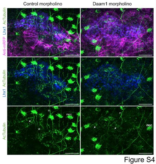 S4 Fig. Daam1-depletion does not lead to the absence of cilia during development of Xenopus embryonic kidneys. To further analyze the effect of Daam1 depletion on ciliogenesis, we fixed 8-cell Daam1 and Standard (control) morpholino injected embryos during early stages of kidney morphogenesis (stage 30). mRFP mRNA was used as a lineage tracer and coinjected with morpholinos. Stage 30-fixed embryos were immunostained with an antibody against anti-mRFP to visualize tracer (magenta) together with an Lhx1 antibody to label nephric progenitor cells (blue) and acetylated α-Tubulin antibody to label primary cilia (green). Subsequently, embryos were analyzed using a confocal laser-scanning microscope and representative maximum projections of Z-stack sections are shown. Acetylated α-Tubulin antibody stains primary cilia (white arrows), neurons (n) and multiciliated epidermal cells (mcc). Scale bar is equal to 50 μm. |