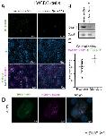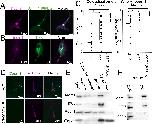 Fig 2. sh-daam1 depleted MDCKII cells show reduced luminal ciliogenesis in 3D cultures. Control and sh-daam1-depleted cells were cultured in collagen I matrix to form cysts. After 12â14 days in culture, cysts were fixed and stained with an antibody against acetylated α-Tubulin (acTubulin) to visualize primary cilia (green), phalloidin for F-actin (magenta) and DAPI for nuclei (blue). Using confocal imaging we analyzed the effect of Daam1 depletion on ciliogenesis. A) Representative merged confocal images showing reduction of luminal cilia upon Daam1 knockdown. White arrow points to luminal cilia in control cysts. Scale bars equal to 10 μm. B) The graph shows quantification of cysts with luminal cilia for each condition. Twenty randomly chosen cyst per sample were analyzed in three independent experiments. Error bars are shown as ± SD; Significance was calculated using unpaired, two-tailed t-test; ns indicates p > 0.05, * indicates p < 0.05, **p < 0.01 C) Western blot showing Daam1 protein levels in wild-type (control) cells and in cells expressing different shRNAs targeting Daam1. GAPDH was used as loading control. |