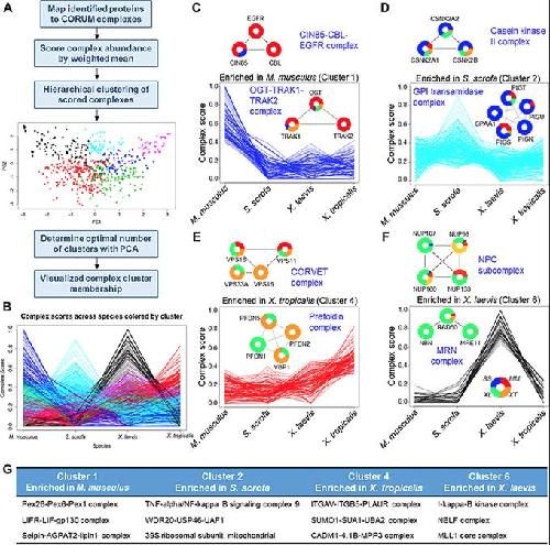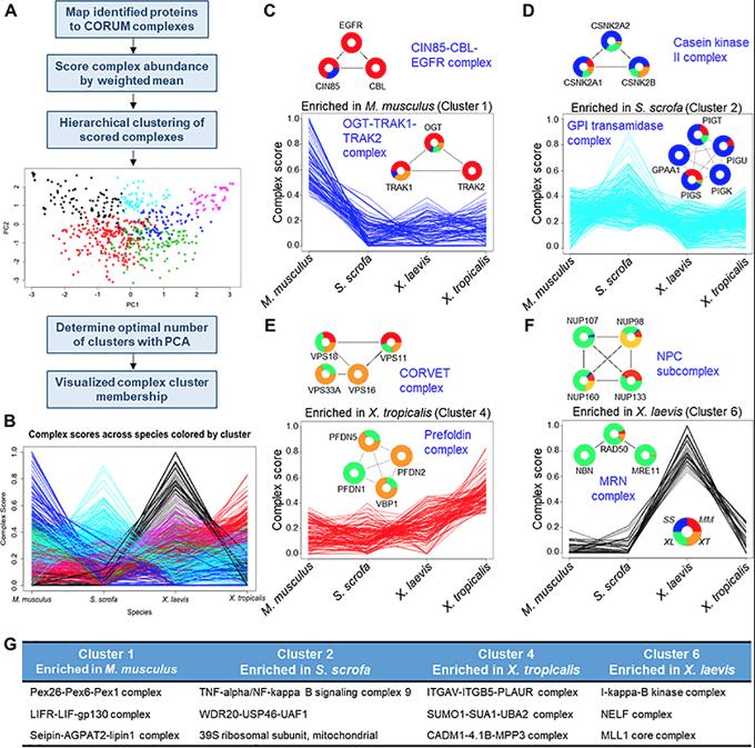 Fig 2. Evolutionary comparison of protein complexes. (A) Proteins detected in this study were mapped to known human protein complexes listed in CORUM. (B) A complex score was calculated from the MS1 peak area of individual protein components of each complex. These complexes were then clustered into 6 clusters and analyzed further. (C–F) Individual clusters are plotted along with example protein complexes, demonstrating the underlying abundance data that drove the complex clustering. (G) Three representative complexes for each cluster are listed. See S9 Table for numerical data underlying figure. CORUM, Comprehensive Resource of Mammalian Protein Complexes. |