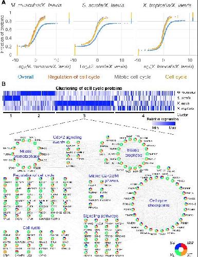 Fig 3. GSEA reveals the increased relative abundance in cell-cycle proteins in Xenopus laevis. (A) Pairwise GSEA was carried out between X. laevis and the 3 other species, revealing an enrichment (adjusted p ≤ 0.05) in cell cycle related proteins in X. laevis. (B) All proteins found in any enriched cell cycle related category by GSEA were clustered using k means (k = 4). Relative protein abundance is shown. The proteins found in cluster 3 were further analyzed in Cytoscape and grouped by function to show the interrelated nature of the proteins enriched in this cluster. See S13 Table and S14 Table for numerical data underlying figure. GSEA, Gene Set Enrichment Analyses. |