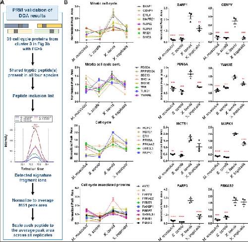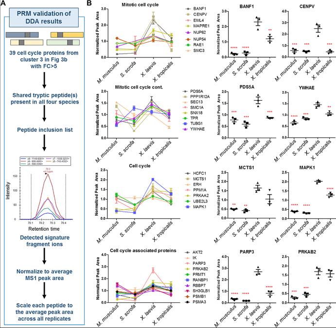Fig 4. Validation of cell-cycle enrichment in X. laevis using targeted MS. (A) Workflow of target protein and peptide selection for PRM MSâbased validation. (B) Mean protein abundance with SEM in each species by PRM assay is shown. The data were grouped by functional classes for visualization. For all proteins in (B), Xenopus laevis was significantly (p ⤠0.05) higher than at least one other species. Shown to the right of each graph are examples of the most enriched proteins in each functional class (**p ⤠0.01, ***p ⤠0.001, ****p ⤠0.0001). See S16 Table for numerical data underlying figure. DDA, data dependent analysis; MS, mass spectrometry; PRM, parallel reaction monitoring. |