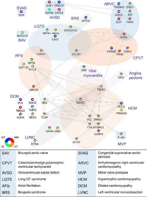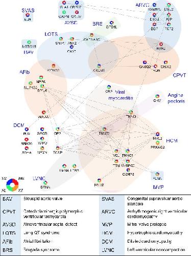 Fig 5. Association of cardiac protein abundance and model system for selected proteins with known roles in human cardiac disease. A diagram of detected proteins with links to human heart disease reported in the KEGG database was created in Cytoscape showing relative protein abundance data across the 4 species examined here, as well as known proteinâprotein interactions between these heart diseaseârelated proteins. See S8 Table for numerical data underlying figure. AFib, atrial fibrillation; ARVC, arrhythmogenic right ventricular cardiomyopathy; AVSD, atrioventricular septal defect; BAV, bicuspid aortic valve; BRS, brugada syndrome; CPVT, catecholaminergic polymorphic ventricular tachycardia; DCM, dilated cardiomyopathy; HCM, hypertrophic cardiomyopathy; LQTS, long QT syndrome; LVNC, left ventricular noncompaction; MVP, mitral valve prolapse; SVAS, congenital supravalvar aortic stenosis. |