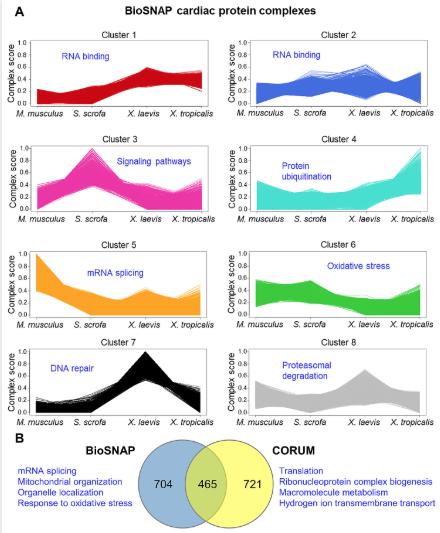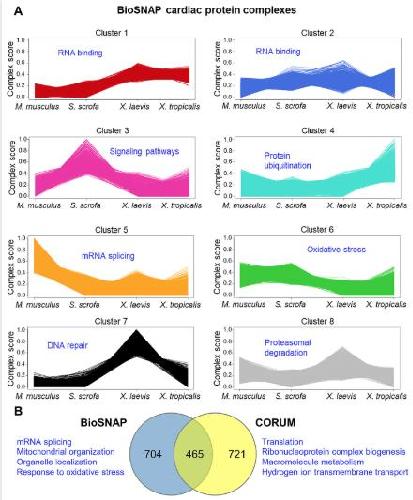 S14 Fig. BioSNAP complex clustering. (A) The 8 clusters resulting from mapping the 4 species data set to cardiac complex information in BioSNAP are shown. One of the top GO terms for each cluster is show in blue. (B) Comparison of BioSNAP and CORUM complex analysis. Top enriched GO terms for each unique set of proteins are listed. See S10 Table for numerical data underlying figure. CORUM, Comprehensive Resource of Mammalian Protein Complexes; GO, Gene Ontology. |