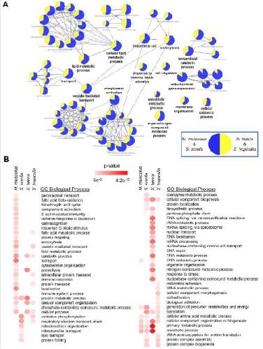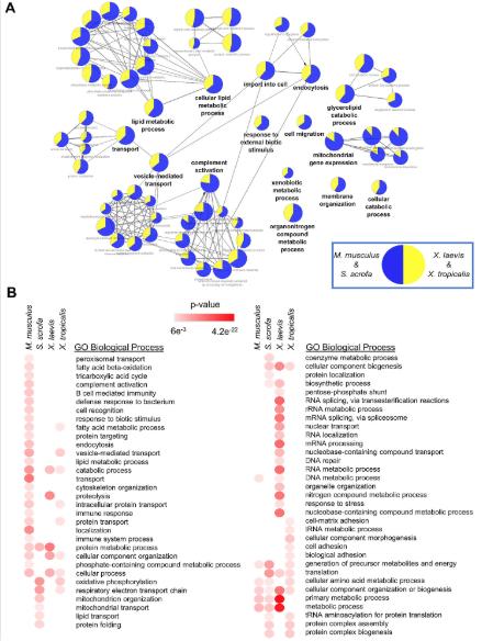 S16 Fig. Analysis of species unique proteins. (A) The proteins uniquely identified in the mammalian and Xenopus species were used to examine evolutionary driven protein expression differences in these organisms using ClueGO (B) Proteins found uniquely in one species only were combined with the cluster of proteins that were more highly expressed in that species and analyzed for overrepresentation of GO biological process terms. The p-values of the significantly enriched terms are shown in a heat map. See S12 Table for numerical data underlying figure. GO, Gene Ontology. |