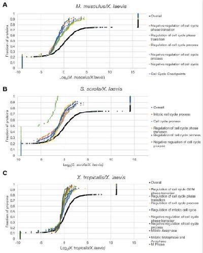 S17 Fig. Cell cycle GO enrichments in every pairwise comparison with X. laevis. (A) M. musculus/X. laevis; (B) S. scrofa/X. laevis; (C) X. tropicalis/X. laevis. See S13 Table and S14 Table for numerical data underlying figure. GO, Gene Ontology. |