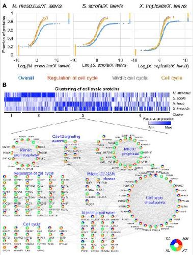 S18 Fig. Gene duplication corrected cell-cycle analysis. Data from Fig 3 were reproduced here with correction for gene duplication in X. laevis. Similar trends were observed as before. See S15 Table for numerical data underlying figure. |