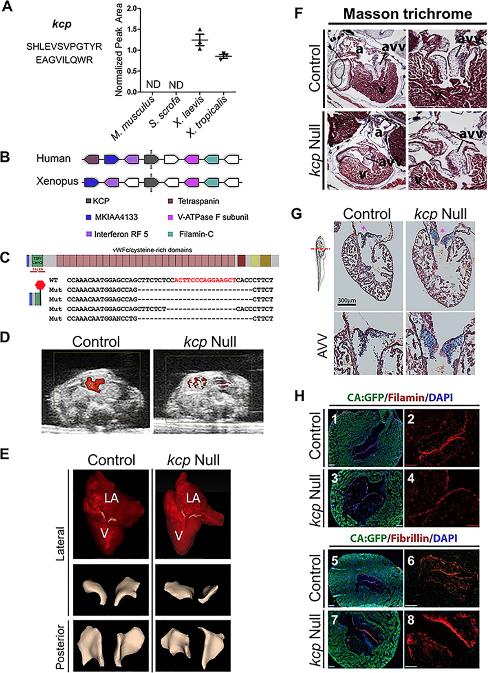 Fig 6. Kcp is essential for heart development and survival in X. laevis. (A) PRM quantification of peptides specific for Kcp confirms that Kcp is enriched in Xenopus. (B) Human and Xenopus show chromosomal synteny as revealed by Metazome. KCP is indicated in black. Upstream and downstream genes are colored as indicated. (C) Schematic of Kcp showing relative position of TALEN-induced mutations and bottom predicted protein generated by TALEN mutagenesis. (D) Stiol images of ultrasound Doppler of living wild type and Kcpδexon2/ δexon2 at Stage 64 positioned with dorsal top, ventral bottom of image. Blood flow shown in red. (E) Contrast-enhanced CT imaging of wild-type and Kcpδexon2/ δexon2 hearts (Stage 64) with AVV highlighted in white, bottom panels show lateral and posterior views showing thicker and misshapen AVV in Kcpδexon2/ δexon2 hearts verses control. (F) The AVV are detached from the muscular walls in Kcp mutants. Transverse sections through Masson trichrome stained Stage 64 control hearts (heterozygous) at low (upper left panel) and high (upper right panel) magnification focused on the AVV. Similar sections through a Kcp null froglet in at low (lower left panel) and high (lower right panel) magnification. Note in lower left panel an enlarged AVV in the outer valve leaflet detaching from the muscle wall. (G) Histology of wild-type and Kcpδexon2/ δexon2 hearts with Alcian Blue staining shows massive accumulation of collagen (blue) in AVV. a* Denotes position of AVV. (H) AVVs in kcp null hearts show a decrease in Filamin A and a concomitant increase in Fibrilin in the outer valve leaflet. (1â8) Immunochemistry of Cardiac-Actin:GFP (marking cardiomyocytes with GFP) froglets stained for Filamin (red), and DAPI (blue) in (1 and 2) heterozygous controls and (3 and 4) Kcp null. (5 and 6) Immunochemistry of Cardiac-Actin:GFP (marking cardiomyocytes with GFP) froglets stained for Fibrillin (red) and DAPI (blue) in (5 and 6) heterozygous controls and (7 and 8) Kcp null. See S16 Table for numerical data underlying figure. a, atria; avv, atrioventricular valve; GFP, green fluorescent protein; Kcp, Kielin/chordin-like protein; PRM, parallel reaction monitoring; TALEN, transcription activator-like effector nuclease; v, ventricle. |
