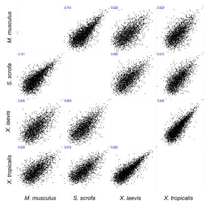 S7 Fig. Multiscatter plot of median-normalized precursor values across the 4 species. The 2 Xenopus species exhibit the greatest degree of similarity. |
