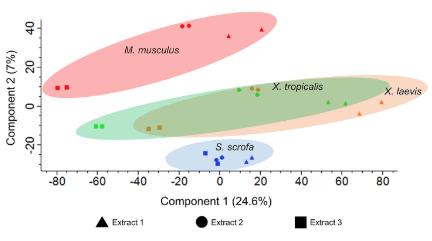 S8 Fig. PCA analysis of proteins identified in each extract from each species. See S3 Table for numerical data underlying figure. PCA, principal component analysis. |