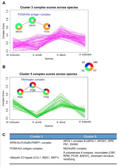 S12 Fig. Individual clusters 3 (A) and 5 (B) from the protein complex clustering in Fig 2 are shown and the top 3 complexes from each cluster are listed (C). See S9 Table for numerical data underlying figure. |