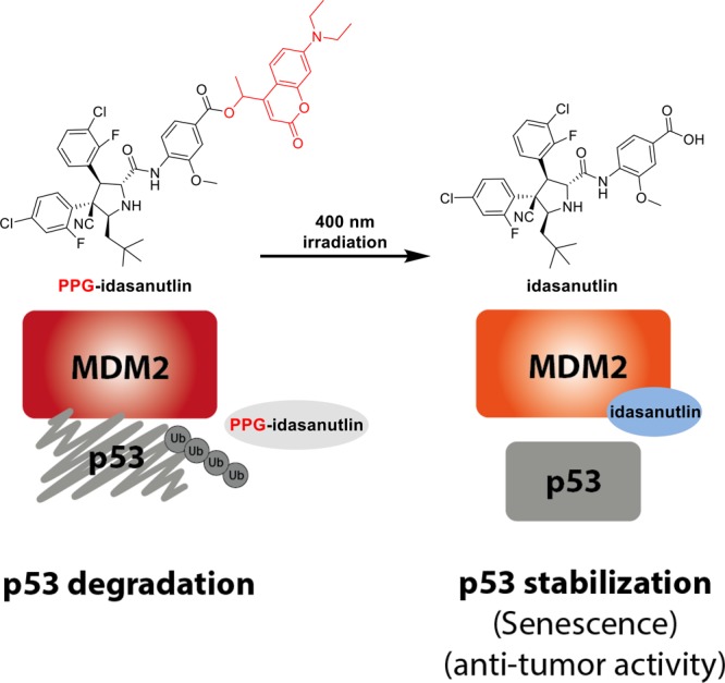 p53 stabilization. Caged inhibitor (PPG-idasanutlin) is not able to