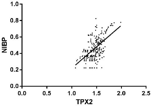 Figure 3. Correlation analysis of TPX2 and NIBP. Pearsons analysis showed that there is a positive correlation between TPX2 expression and NIBP expression in esophageal cancer tissues, with significant difference (P<0.001). TPX2, Xenopus kinesin-like protein 2; NIBP, NIK-IKK-β binding protein.