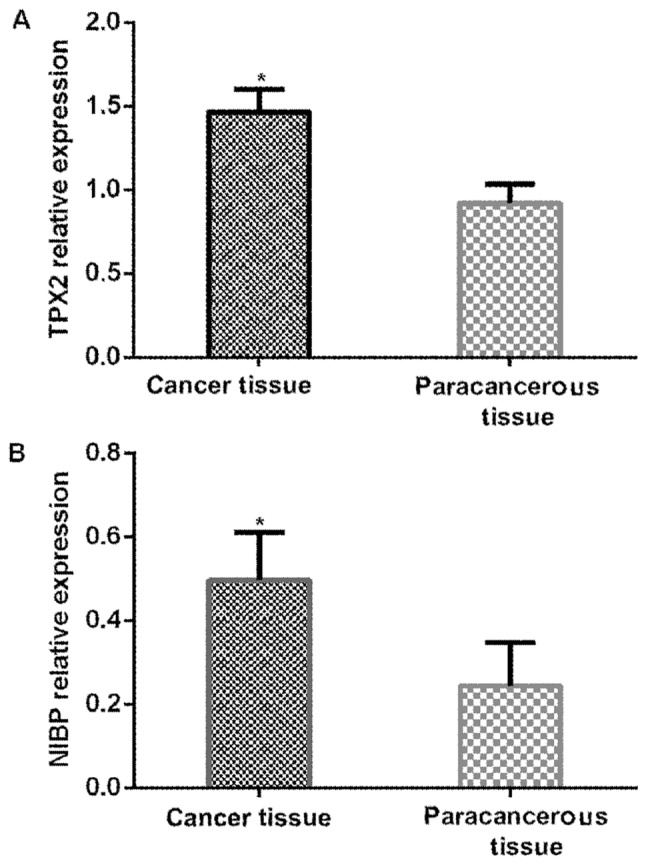 Figure 1. Expression of TPX2 and NIBP in esophageal cancer. (A) The expression of TPX2 in esophageal cancer tissues. RT-qPCR results show that the relative expression of TPX2 in esophageal cancer tissues was significantly higher than that in adjacent normal tissues. (B) The expression of NIBP in esophageal cancer tissues. RT-qPCR results show that the relative expression of NIBP in esophageal cancer tissues was significantly higher than that in adjacent normal tissues. *P<0.05, compared with adjacent normal tissues. TPX2, Xenopus kinesin-like protein 2; NIBP, NIK-IKK-β binding protein.