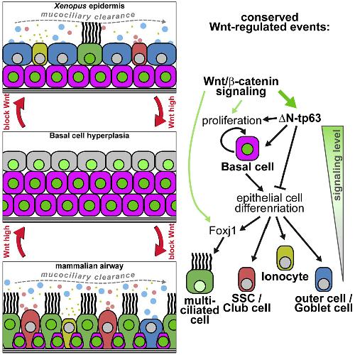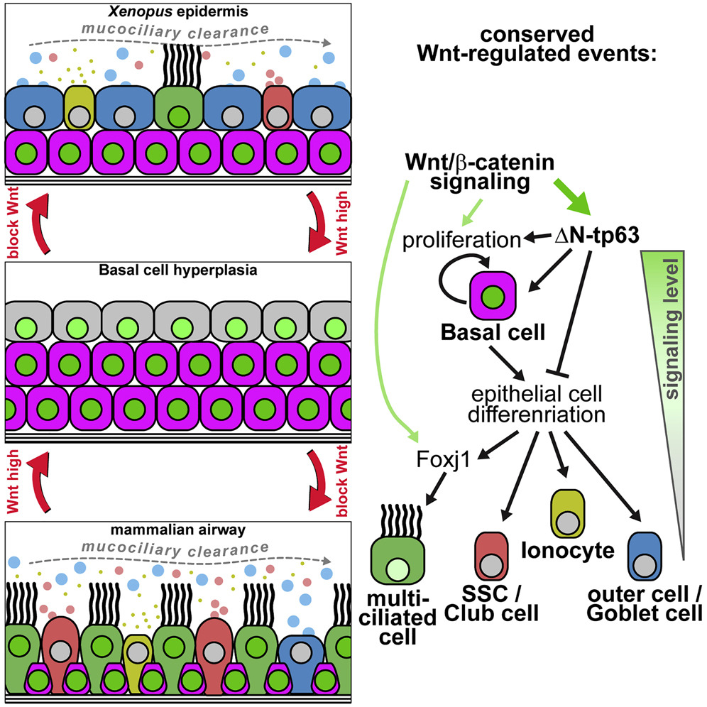 Mucociliary epithelia provide a first line of defense against pathogens. Impaired regeneration and remodeling of mucociliary epithelia are associated with dysregulated Wnt/β-catenin signaling in chronic airway diseases, but underlying mechanisms remain elusive, and studies yield seemingly contradicting results. Employing the Xenopus mucociliary epidermis, the mouse airway, and human airway Basal cells, we characterize the evolutionarily conserved roles of Wnt/β-catenin signaling in vertebrates. In multiciliated cells, Wnt is required for cilia formation during differentiation. In Basal cells, Wnt prevents specification of epithelial cell types by activating ΔN-TP63, a master transcription factor, which is necessary and sufficient to mediate the Wnt-induced inhibition of specification and is required to retain Basal cells during development. Chronic Wnt activation leads to remodeling and Basal cell hyperplasia, which are reversible in vivo and in vitro, suggesting Wnt inhibition as a treatment option in chronic lung diseases. Our work provides important insights into mucociliary signaling, development, and disease.
