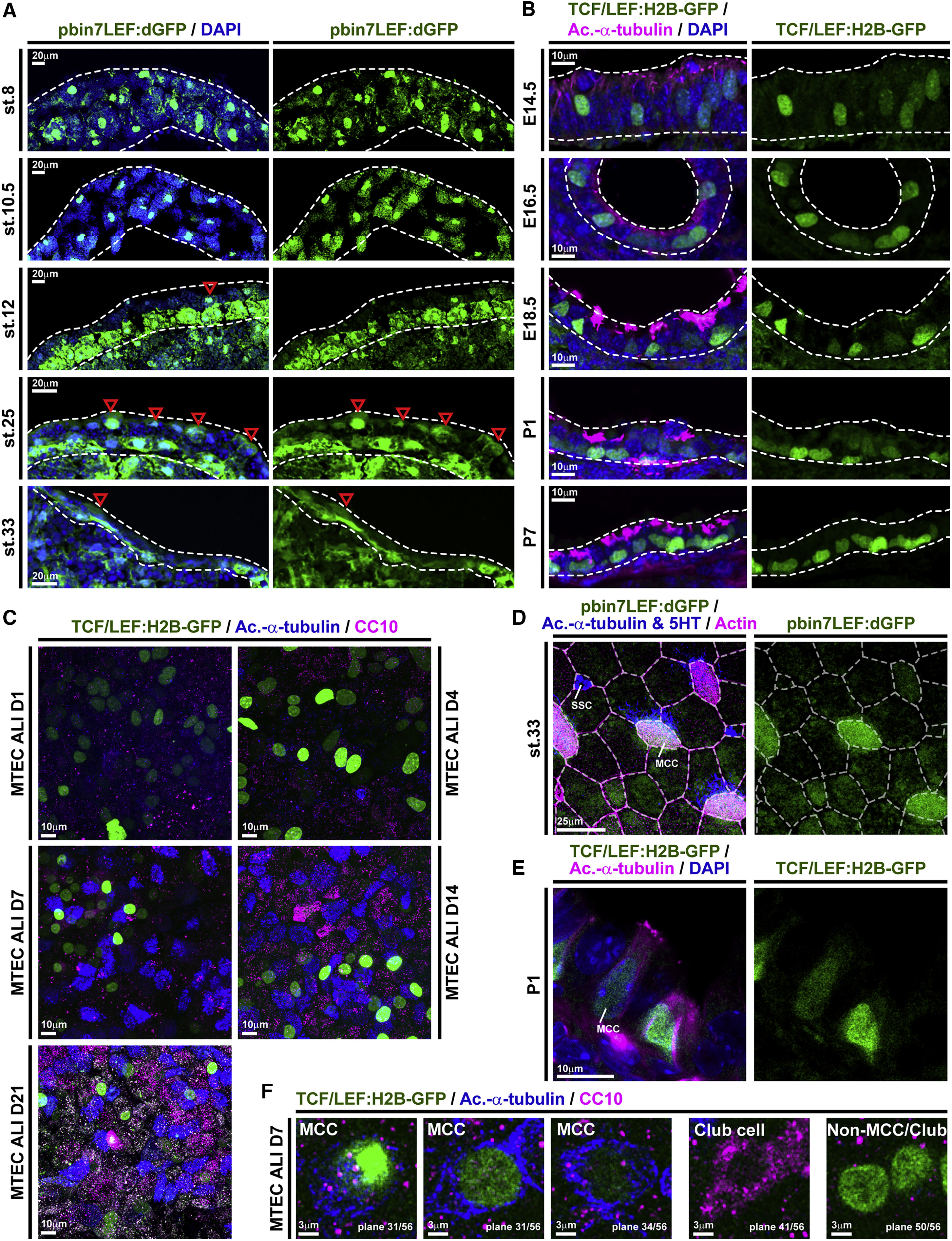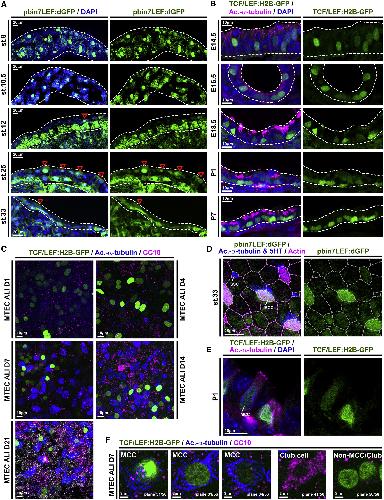 Figure 1. Wnt/β-Catenin Signaling Is Active in MCCs and Basal Progenitors (A) Analysis of Wnt/β-catenin activity in the X. laevis mucociliary epidermis using the pbin7LEF:dGFP reporter line (green). Nuclei are stained by DAPI (blue). Red arrowheads indicate GFP-positive cells in the outer epithelial layer. Dashed lines outline the epidermal layers. Embryonic stages (st. 8â33) are indicated. (B) Analysis of Wnt/β-catenin activity in the mouse developing airway mucociliary epithelium using the TCF/LEF:H2B-GFP reporter line (green). Nuclei are stained by DAPI (blue) and MCCs are marked by acetylated-α-tubulin (Ac.-α-tubulin, magenta) staining. Dashed lines outline the epithelium. Embryonic (E14.5â18.5) and post-natal (P1â7) stages are indicated. (C) MTEC ALI cultures generated from the TCF/LEF:H2B-GFP reporter line (green) and cultured up to 21 days (D21) revealed Wnt signaling activity throughout the different stages. n = 3 cultures per time point. MTECs were stained for Ac.-α-tubulin (blue) and CC10 (magenta). Only primary cilia were present at days 1 and 4 (D1 and 4), and MCCs could be detected from day 7 (D7) onward. (D) En-face imaging of the mature Xenopus epidermis at st. 33 shows elevated signaling levels (green) in MCCs (Ac.-α-tubulin, blue). SSCs (5HT, blue). Cell membranes are visualized by actin staining (magenta). (E) Immunostaining for Ac.-α-tubulin (magenta) and nuclei (DAPI, blue) shows high levels of Wnt signaling (green) in cells with BC morphology and intermediate signaling levels in differentiating MCCs. (F) Single confocal sections of MTECs at ALI day 7 (D7) show MCCs (Ac.-α-tubulin, blue) with variably elevated signaling levels (green), Club cells (CC10, magenta) without Wnt activity, and non-MCC/non-Club cells with elevated Wnt signaling levels at the base. Related to Figure S1. |