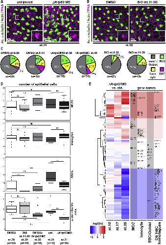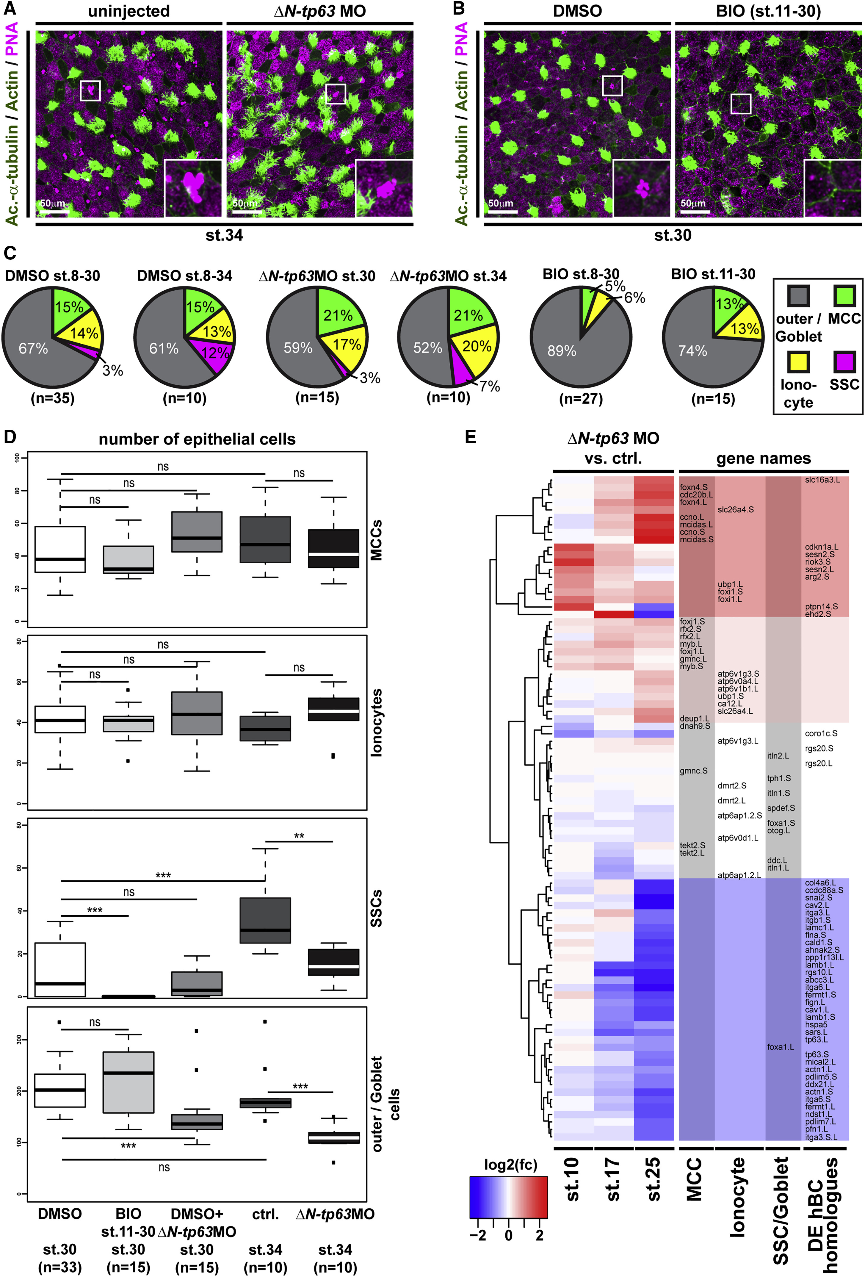 Figure 5. Knockdown of ÎN-tp63 Stimulates MCC and Ionocyte Specification at the Expense of BC and SSCs in Xenopus (AâD) Analysis of cell type composition by confocal microscopy and staining for MCCs (Ac.-α-tubulin, green), Ionocytes (no staining, black), SSCs (large vesicles, PNA staining, magenta), and Goblet (outer-layer) cells (small granules, PNA staining, magenta) at st. 34 (A) and st. 30 (B). Actin staining (green). (A) ÎN-tp63 MO increases MCC and Ionocyte numbers but reduces numbers of SSCs. (B) BIO application from st. 11 does not affect MCC and Ionocyte numbers but prevents specification of SSCs. (C and D) Quantification from (A) and (B), respectively. Mann Whitney test, not significant, ns (p > 0.05); âp ⤠0.05; ââp ⤠0.01; âââp ⤠0.001. (E) RNA sequencing at st. 10, 17, and 25 on Xenopus mucociliary organoids comparing controls to ÎN-tp63 MO injected. n = 3 per stage and treatment. Heatmap and hierarchical clustering of log2 fold changes (fcs) in cell type gene expression in ÎN-tp63 morphants relative to controls. âUpregulatedâ clusters (red); âdownregulatedâ cluster (blue). Related to Figure S5. |