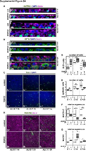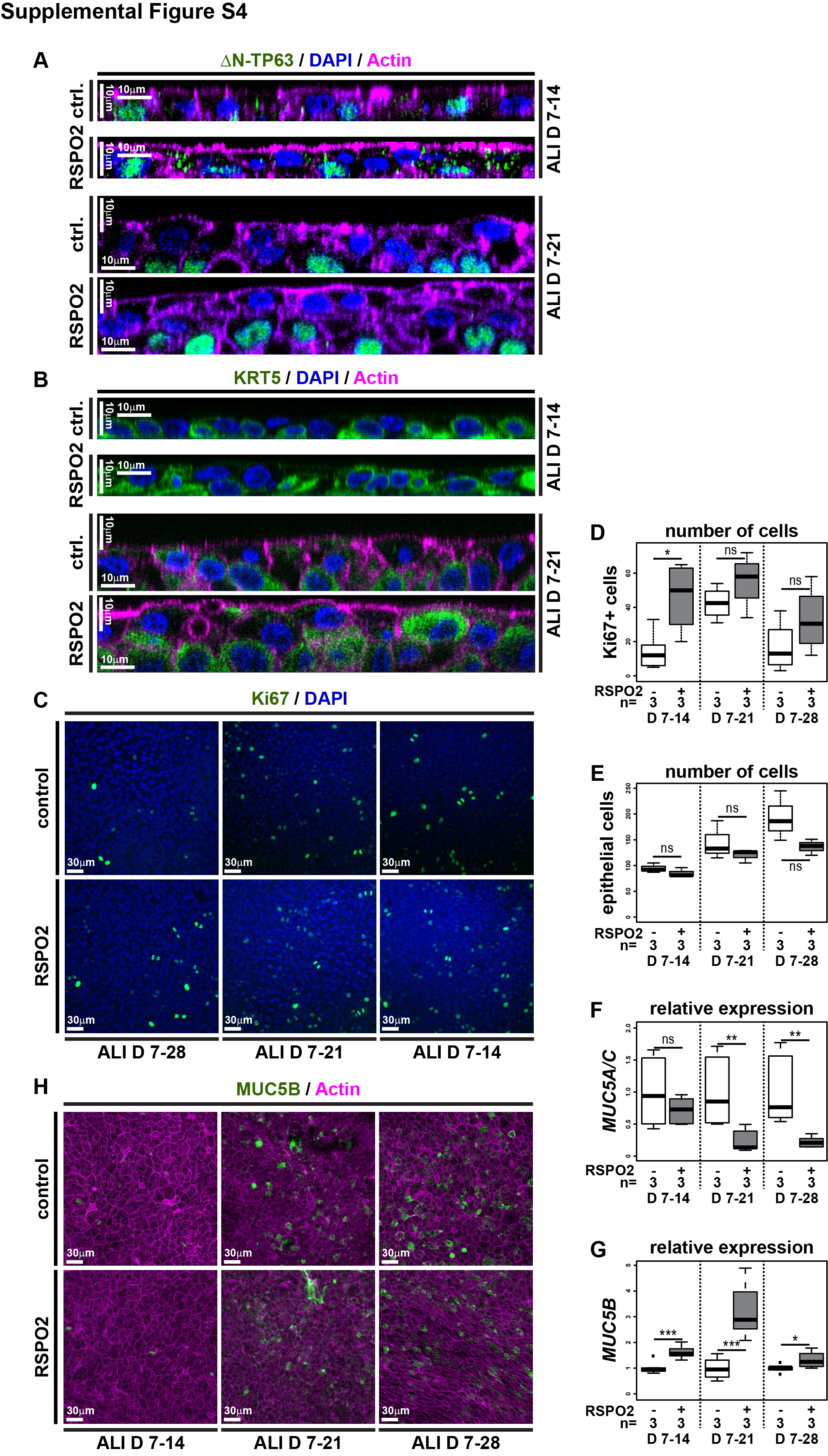 Supplemental Figure S4: Analysis and quantification of gain of Wnt/β-Catenin effects in BCIs, Related to Figure 4. (A-H) Human BCIs cultured in ALI conditions for up to 4 weeks. RSPO2 was used to activate Wnt/β-Catenin signaling starting at ALI day 7 (D7). N=3 cultures per timepoint and treatment. (A,B) Optical orthogonal sections of confocal images. RSPO2-treated cultures display increased epithelial thickness and cells staining for BC markers δN-TP63 (green, in A) and KRT5 (green, in B) over time of regeneration. Actin (magenta) staining reveals membranes and nuclei are stained with DAPI (blue). Related to Figure 3E and F. (C) Ki67 (green) staining reveals proliferating cells. Nuclei are stained with DAPI (blue). (D) Quantification of results depicted in (C). (E) Quantification of epithelial cell numbers. Related to Figure 3A. Mann Whitney test, not significant, ns = P>0.05; * = Pâ¤0.05. (F, G) qPCR expression levels are depicted relative to stage controls. RSPO2 reduces expression of Goblet cell marker MUC5A/C, but increase expression of the Goblet marker MUC5B. Studentâs t-test, not significant, ns = P>0.05; * = Pâ¤0.05; ** = Pâ¤0.01; ***= Pâ¤0.001. Related to Figure 3D. (H) MUC5B (green) staining reveals no increase in Goblet cell numbers in the epithelium of RSPO2 treated cultures. Actin (cell membranes, magenta). |