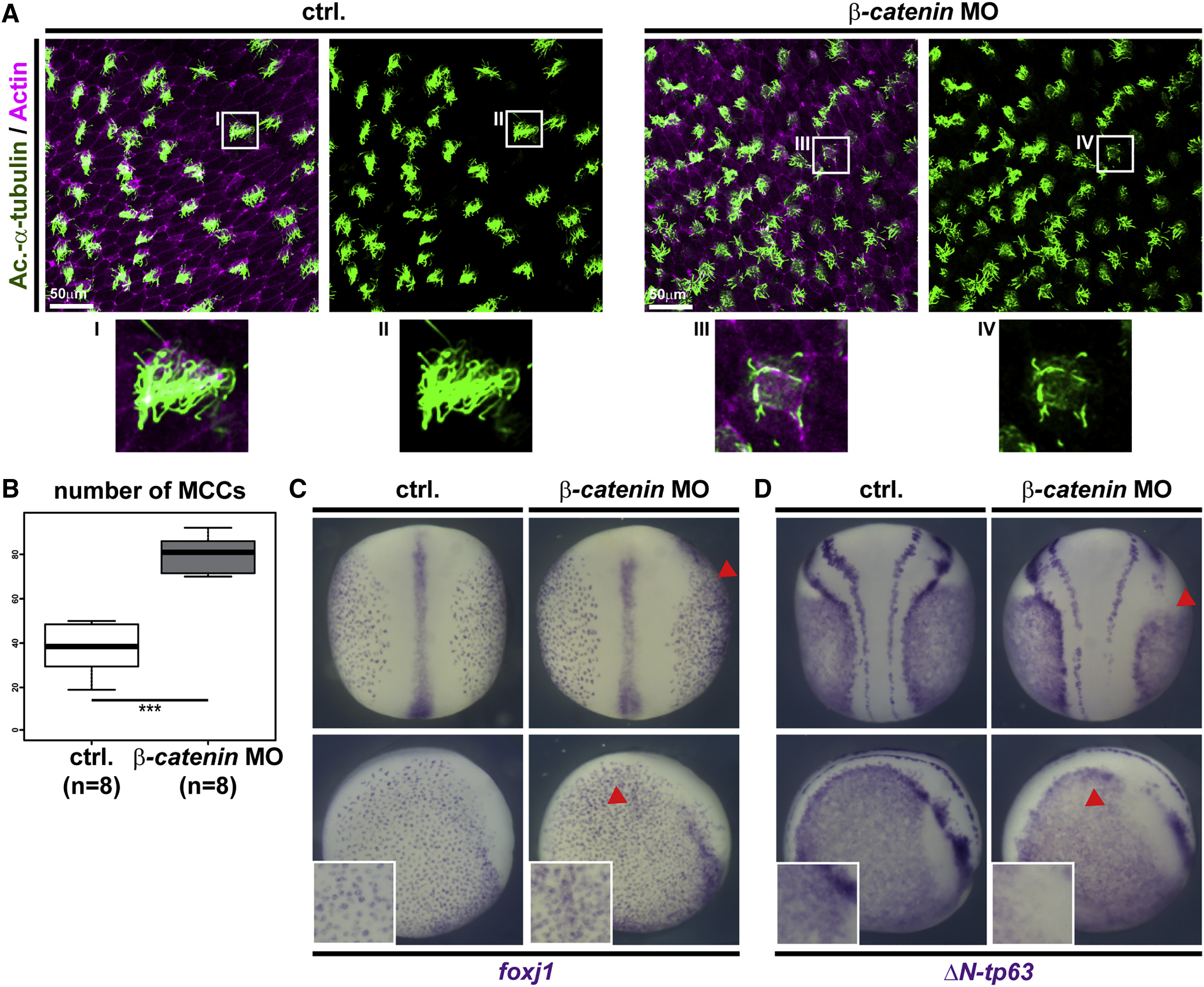 Figure 2. Wnt/β-Catenin Regulates MCC Numbers and DeltaN-tp63 Expression (A) Morpholino-oligonucleotide (MO) knockdown of β-catenin in Xenopus increases MCC numbers (Ac.-α-tubulin, green), but MCCs present fewer and shorter cilia than controls (ctrl.). Actin staining (magenta). Insets indicate locations of magnified areas IâIV. (B) Quantification of results depicted in (A). Mann Whitney test, âââ p ⤠0.001. (C) ISH reveals increased MCC numbers (foxj+ cells) after unilateral knockdown of β-catenin (β-catenin MO). Controls (n = 13); β-catenin MO (n = 22). (D) ISH reveals decreased DeltaN-tp63 expression after β-catenin MO. Controls (n = 27); β-catenin MO (n = 37). In (B) and (C), the injected side is indicated by red arrowheads. Dorsal views are shown in upper panels, lateral views are shown in the lower panels, and magnified views are depicted in white boxes. |