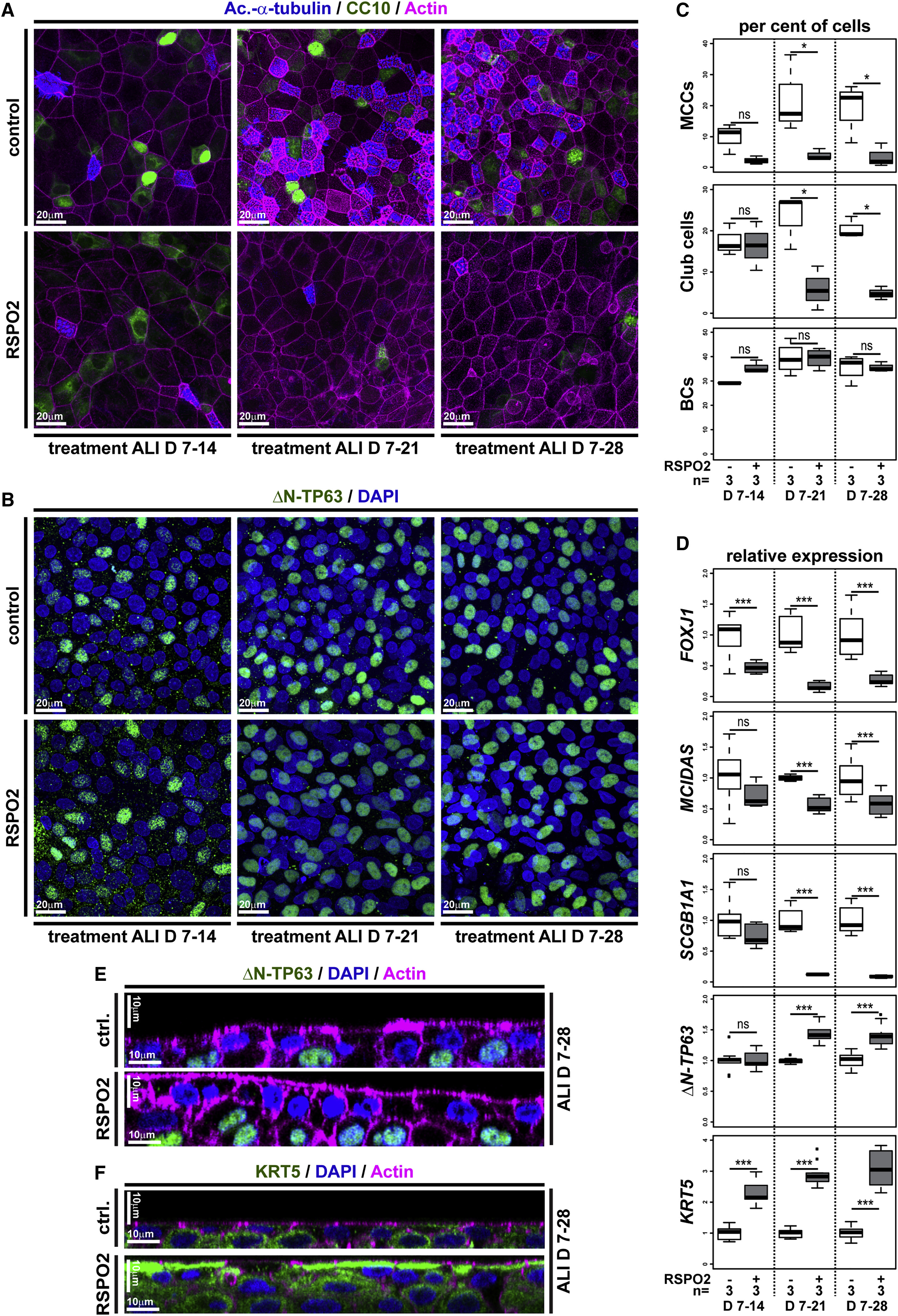 Figure 4. Wnt/β-Catenin Signaling Inhibits Differentiation and Promotes Stemness in Human BCs (AâF) Human immortalized BC (BCIs) kept in air-liquid interface (ALI) culture for up to 4 weeks. Human recombinant R-spondin2 (RSPO2) was used to activate Wnt/β-catenin signaling starting at ALI day 7 (D7). n = 3 cultures per time point and treatment. (A) Confocal imaging of specimens stained for Ac.-α-tubulin (MCCs, blue), CC10 (Club cells, green), and Actin (cell membranes, magenta) show reduced MCC and Club cell numbers in RSPO2-treated cultures. (B) RSPO2 does not reduce the number of ÎN-TP63+ (green) cells. Nuclei (DAPI, blue). (C) Quantification from (A) and (B). Mann Whitney test, not significant, ns (p > 0.05); âp ⤠0.05; ââp ⤠0.01; âââp ⤠0.001. (D) Quantitative real-time PCR. Expression levels are depicted relative to stage controls. RSPO2 reduces expression of MCC (FOXJ1, MCIDAS) and Club cell (SCGB1A1) markers but increases expression of BC markers (ÎN-TP63, KRT5). Studentâs t test, not significant, ns (p > 0.05); âp ⤠0.05; ââp ⤠0.01; âââp ⤠0.001. (E and F) Optical orthogonal sections of confocal images. RSPO2-treated cultures display increased epithelial thickness and cells staining for BC markers ÎN-TP63 (green, in E) and KRT5 (green, in F). Related to Figure S4. |