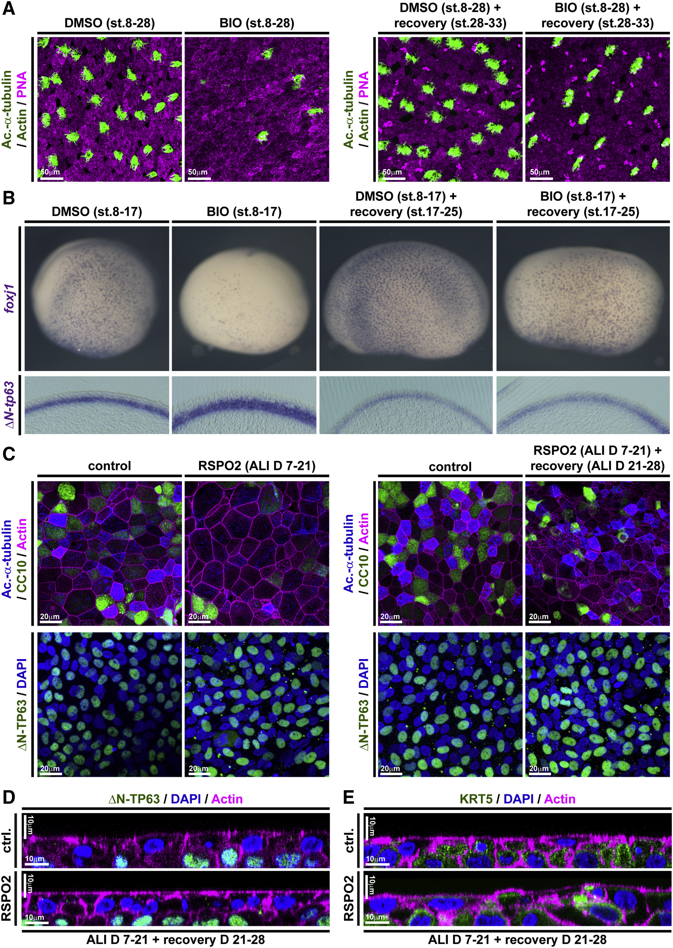Figure 7. Wnt/β-Catenin-Induced Increase in BCs and Loss of Epithelial Differentiation Are Reversible (A and B) In Xenopus, BIO treatments from st. 8â17 or st. 8â30 inhibit differentiation as compared to DMSO treated controls, but the epithelium can regenerate after removal of BIO and recovery until st. 33 (A) or st. 25 (B). (A) BIO treatment reduces MCC (Ac.-α-tubulin, green), Ionocyte (no staining, black), and SSC (large vesicles, PNA staining, magenta) numbers in confocal micrographs at st. 28, which recover after regeneration until st. 33. Actin staining (green). (B) ISH shows reduction in foxj1 expressing cells and an increase in ÎN-tp63 expression in BIO-treated whole mounts (upper row) and transversal sections (bottom row) at st. 17, which both recover after regeneration until st. 25. DMSO (n = 5); BIO st. 17 (n = 5); DMSO st. 25 (n = 5); BIO+recovery st. 25 (n = 5). (C) Confocal imaging of specimens stained for Ac.-α-tubulin (MCCs, blue), CC10 (Club cells, green), and Actin (cell membranes, magenta) show reduced MCC and Club cell numbers in RSPO2-treated cultures from ALI D7 to D21 but regeneration of MCCs and Club cells at ALI D28. n = 3 cultures per time point and treatment (upper panels). No loss of ÎN-TP63+ (green) BCs is observed in these experiments (bottom panels). Nuclei (DAPI, blue). (D and E) Optical orthogonal sections of confocal images. RSPO2-treated cultures display normalized epithelial thickness and staining for BC markers ÎN-TP63 (green, in D) and KRT5 (green, in E) after regeneration at ALI D28. |