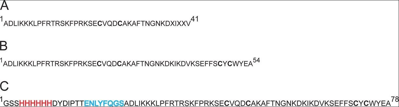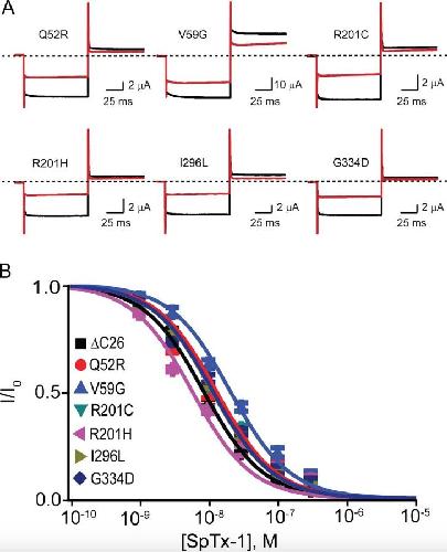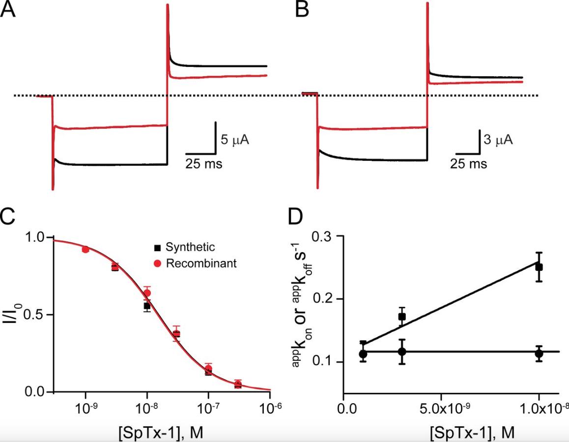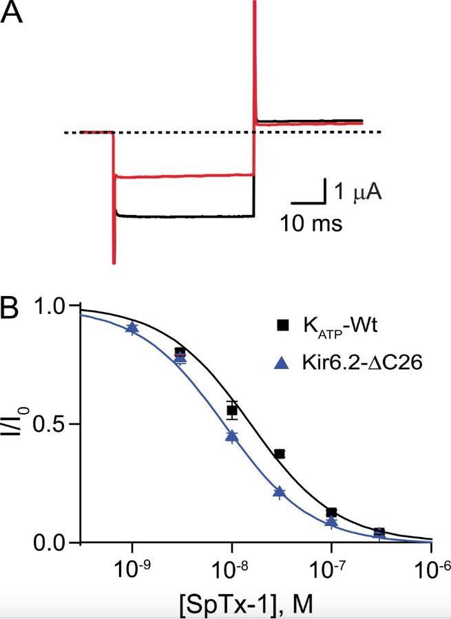 The adenosine triphosphate (ATP)-sensitive (KATP) channels in pancreatic β cells couple the blood glucose level to insulin secretion. KATP channels in pancreatic β cells comprise the pore-forming Kir6.2 and the modulatory sulfonylurea receptor 1 (SUR1) subunits. Currently, there is no high-affinity and relatively specific inhibitor for the Kir6.2 pore. The importance of developing such inhibitors is twofold. First, in many cases, the lack of such an inhibitor precludes an unambiguous determination of the Kir6.2's role in certain physiological and pathological processes. This problem is exacerbated because Kir6.2 knockout mice do not yield the expected phenotypes of hyperinsulinemia and hypoglycemia, which in part, may reflect developmental adaptation. Second, mutations in Kir6.2 or SUR1 that increase the KATP current cause permanent neonatal diabetes mellitus (PNDM). Many patients who have PNDM have been successfully treated with sulphonylureas, a common class of antidiabetic drugs that bind to SUR1 and indirectly inhibit Kir6.2, thereby promoting insulin secretion. However, some PNDM-causing mutations render KATP channels insensitive to sulphonylureas. Conceptually, because these mutations are located intracellularly, an inhibitor blocking the Kir6.2 pore from the extracellular side might provide another approach to this problem. Here, by screening the venoms from >200 animals against human Kir6.2 coexpressed with SUR1, we discovered a small protein of 54 residues (SpTx-1) that inhibits the KATP channel from the extracellular side. It inhibits the channel with a dissociation constant value of 15 nM in a relatively specific manner and with an apparent one-to-one stoichiometry. SpTx-1 evidently inhibits the channel by primarily targeting Kir6.2 rather than SUR1; it inhibits not only wild-type Kir6.2 coexpressed with SUR1 but also a Kir6.2 mutant expressed without SUR1. Importantly, SpTx-1 suppresses both sulfonylurea-sensitive and -insensitive, PNDM-causing Kir6.2 mutants. Thus, it will be a valuable tool to investigate the channel's physiological and biophysical properties and to test a new strategy for treating sulfonylurea-resistant PNDM.