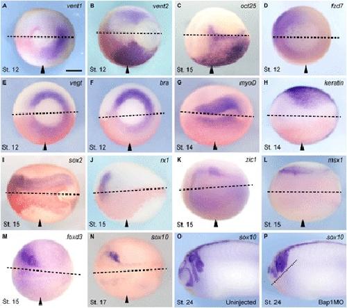 Fig. 2. Bap1 loss deregulates expression of pluripotency and lineage commitment genes.(A to P) Representative embryos injected with 7.5 ng of the Bap1MO morpholino into one blastomere at the two-cell stage (arrowheads indicate injected side) and then fixed and analyzed for mRNA expression of the indicated developmental genes by WISH at the specified stages (gastrula, stage 12; midneurula, stages 14 to 17; early tail bud, stage 24). Bap1-depleted embryos fail to silence pluripotency factors such as vent1/2 (orthologs of mammalian Nanog) and oct25 (ortholog of mammalian Oct4) (A to C) and fail to activate lineage commitment factors such as fzd7 (dorsal mesoderm and ectoderm), vegT and bra (axial mesoderm), myoD (muscle), keratin1 (non-neural ectoderm), sox2 (neural ectoderm), rx1 (early eye field), zic1 and msx1 (neural fold/prospective neural crest), and foxD3 and sox10 (neural crest) (D to N). Bap1 loss results in a failure of neural crest cell migration in sox10-expressing cells compared to the uninjected control (O and P). Panels show the dorsal-caudal view (A, B, and D to F), the dorsal view (C and G to N), or the lateral view (O and P), anterior side left. Dotted lines indicate midline. Arrowheads indicate injected side. Scale bar, 250 μm.