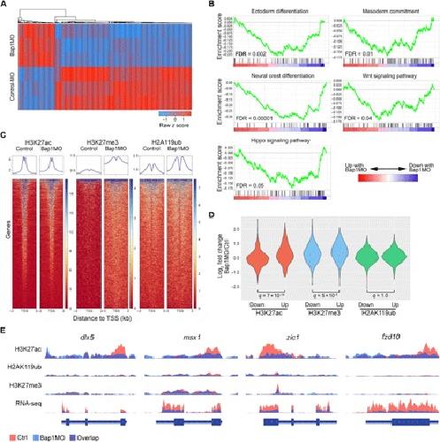 Fig. 3. Loss of Bap1 abrogates the assembly of H3K27ac at promoters of key genes regulating lineage commitment and differentiation.(A) Heat map demonstrating the top 1000 most differentially expressed genes by RNA-seq between embryos at one-cell stage with 15 ng of either Bap1MO or Bap1MO-Ctrl and collected at late gastrulation (stage 12), when morphologic effects of Bap1 loss are first evident. (B) Gene set enrichment analysis (GSEA) plots demonstrating the most highly significant pathways represented by the differentially expressed genes associated with Bap1 loss. FDR, false discovery rate. (C) Heat maps of ChIP-seq data demonstrating global genomic occupancy of the indicated histone marks across all annotated genes in embryos treated as above with either Bap1MO or Bap1MO-Ctrl. TSS, transcription start site. (D) Violin plots summarizing ChIP-seq data restricted to differentially expressed genes. (E) ChIP-seq and RNA-seq tracks of representative lineage commitment genes that fail to assemble H3K27ac at promoters and to activate mRNA expression in Bap1-deficient embryos.