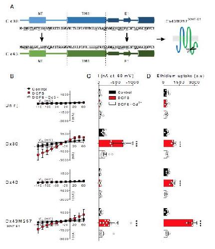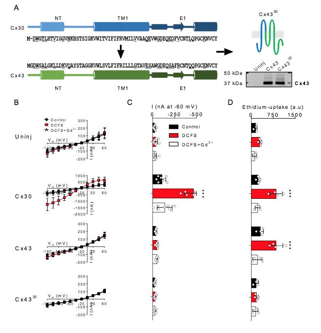 Fig. 3. Cx43 chimera with the predicted pore-lining region of Cx30 display no ion conductance or ethidium uptake. A: Alignment of the N-terminus (NT), transmembrane region 1 (TM1), and extracellular loop 1 (E1) of Cx30 and Cx43 with the predicted pore-lining residues underlined in the amino acid sequence as well as an illustration of Cx43 chimera containing the predicted pore-lining region of Cx30. Western blot of oocyte surface expression of Cx43 and Cx4330 in the right lower corner. B: I-V curves from uninjected-, Cx30-, Cx43-, and Cx4330 -expressing oocytes (n=10, n=8, n=8, and n=8, respectively). C: Summarized membrane currents obtained at -60 mV. D: Ethidium uptake from uninjected-, Cx30-, Cx43-, and Cx4330-expressing oocytes (all n=4). Data in I/V curves and in the bar graphs are presented as mean ± SD. Statistical significance of DCFS-induced hemichannel activity within every group was tested using repeated measures two-way ANOVA (current, interaction: F(8,74) = 214.8, P<0.001; construct: F(4,37) = 54.1, P<0.001; test solution: F(2,74) = 254.4, P<0.001 and Eth, interaction: F(6,24) = 7.2, P<0.001; construct: F(3,12) = 30.0, P<0.001; test solution: F(2,24) = 38.5 P<0.001) with Dunnettâs post hoc test (against control). ***; P < 0.001. |