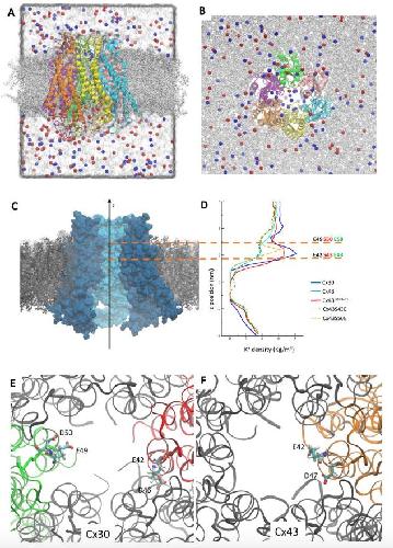 Fig. 6. Molecular dynamics of Cx30, Cx43 and Cx4330NT-E1 hemichannels. A-B: Side (A) and extracellular (B) view of the Cx30 model. The hemichannel is inserted in a phospholipid bilayer and simulations are performed in explicit solvent environment. Each of the six connexins composing the hemichannel are represented with different colors. K+ is blue and Clis red. In panel A, which represents a single snapshot of the simulation, it is possible to notice the accumulation of K+ in the extracellular part of the channel. C: Cx30 hemichannel embedded in the phospholipid bilayer. The proteins are represented according to their predicted solvent accessible surfaces. Two connexins are removed for showing the internal part of the channel. D: The graphs show the K+ density along the Z axis of the different hemichannels during the molecular dynamics simulations. The Z positions are centered on the midpoint of mass of each hemichannel, and the graphs are reported in register with the Cx30 hemichannel represented in panel C. The two orange dotted lines show the position of residues 42 and 49 in Cx30, which corresponds to 43 and 50 for Cx43 and Cx4330NT-E1. It is evident how K+ accumulates in the extracellular vestibule of Cx30 and Cx4330NT-E1, compared with Cx43. E-F: The position of acidic residues facing the pore in the E1 region for Cx30 (E) and Cx43 (F). For clarity, we report the position in one or two connexin polypeptides only. |