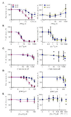 Fig. 7. Permeant-dependent isoform-specific inhibition. A-E (left panels): Cx26- and Cx30-mediated currents were obtained in DCFS with the indicated inhibitor concentrations (n=6-11). Membrane currents were recorded in DCFS from +60 to -140 mV in steps of 20 mV from a holding potential of -30 mV and the currents recorded at -120 mV were used for the inhibitor sensitivity curves upon normalization to the current obtained in the absence of inhibitor or peptide. A-E (right panels): Ethidium uptake was determined in Cx30- and Cx43-expressing oocytes after 40 minutes exposure to DCFS with drug concentrations indicated (n=3-6). For gap27 an additional exposure time of 1 hour (preincubated) were performed with 100 µM and 500 µM (n=3). Uninjected oocyte background uptake was subtracted, and the hemichannel-mediated ethidium uptake was normalized to the control uptake in the absence of inhibitor. Data are presented as mean ± SD. |