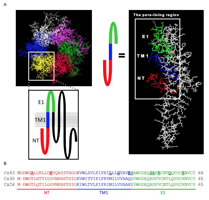 Fig. 1. Homology model of Cx43 and alignment of the predicted pore-lining region of Cx43, Cx30 and Cx26. A: Image depicting a homology model of a Cx43 gap junctional channel (AA 1-244), based on the Cx26 gap junction structure. The predicted pore-lining region is highlighted and colored in the typology drawing as well as the in structure of the Cx43 monomer. B: Alignment of the predicted pore-lining region of Cx43, Cx30 and Cx26. The residues of Cx43 selected for mutagenesis are underscored and highlighted in bold. |